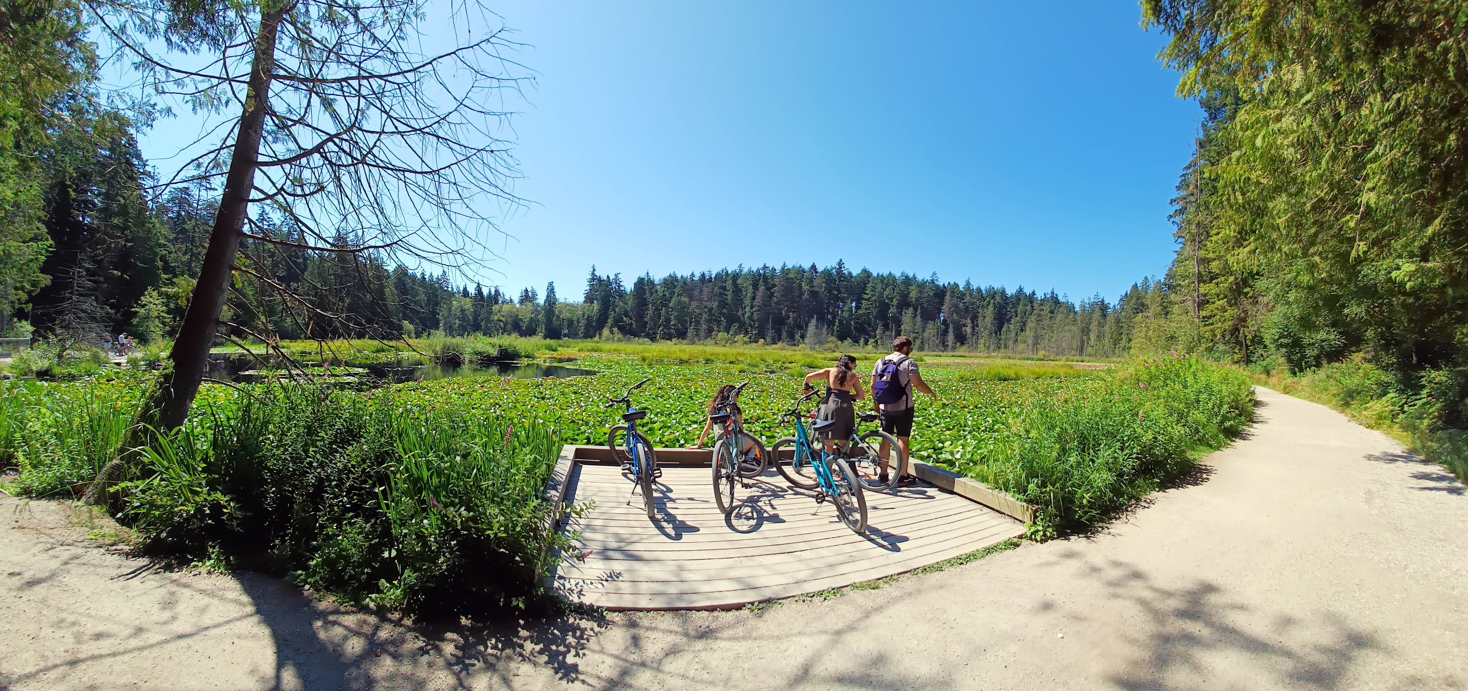 Para recorrer el parque te recomendamos alquilar una bicicleta. Así, en un par de horitas de paseo tranquilo, lo habrás recorrido casi sin darte cuenta, mientras que andando igual se te hace muy largo. Hay varias tiendas de alquiler de bicicletas muy cerca de la entrada al parque y el precio es asequible (unos 7 dólares la hora). El recorrido que hicimos nosotros, y que te recomendamos, es rodear el parque en el sentido contrario a las agujas del reloj (es la dirección en que lo hace todo el mundo y es mejor hacerlo igual, porque a veces el carril bici se estrecha mucho) y luego internarte un poco por los caminos boscosos del centro y acercarte a ver el Beaver Lagoon, lleno de nenúfares. Por el camino, puedes disfrutar de las vistas del puerto, con los hidroaviones aterrizando constantemente, y de los rascacielos del centro de la ciudad como fondo. Casi nada más arrancar tu pedaleo, ya puedes parar para ver unos cuantos tótems; y poco a poco vas rodeando el parque y aparece ante tus ojos la orilla de North Vancouver, donde viven las personas más adineradas de la ciudad en grandes casas con el mar al frente y las boscosas montañas a sus espaldas. Va apareciendo poco a poco también frente a ti el mar abierto e incluso puedes pasear un rato por alguna de las playas con las que te vas topando, casi sin gente (no parecen estar muy bien para el baño).