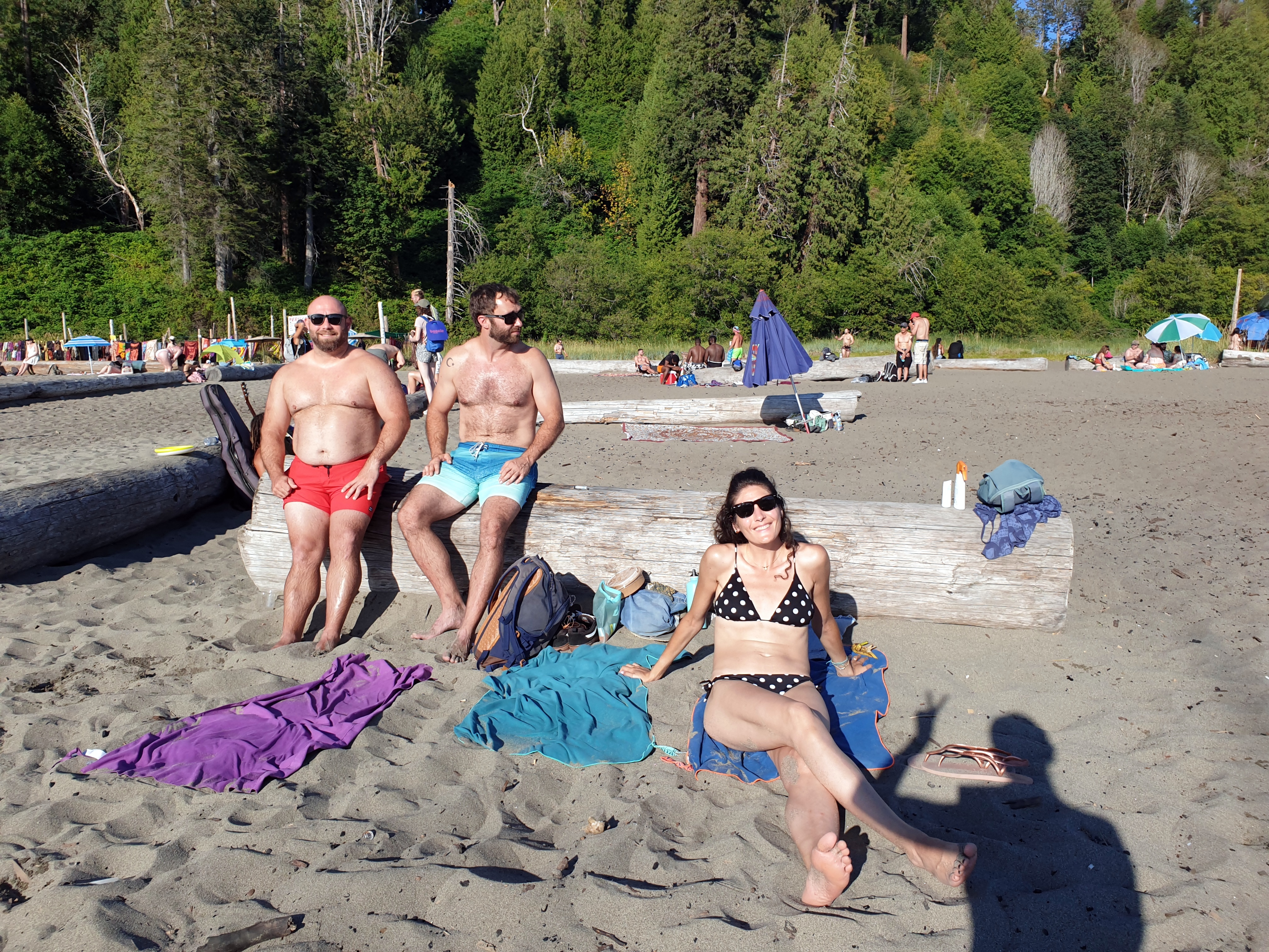 Para acceder a la playa Wreck Beach hay que bajar un largo trecho de escaleras que cruzan un tramo boscoso, por lo que la playa tiene un paisaje más bonito que el del resto de playas de la ciudad, con una muralla de bosque que le guarda las espaldas y al frente el mar abierto, sin ciudad ya, cortado en el horizonte por el perfil montañoso de la Isla de Vancouver. No obstante, aquí vienen las pegas de esta playa: está llenísima de gente y ni la arena ni el agua están demasiado limpias. La playa es nudista, aunque conviven quienes llevan bañador y quienes van en cueros. El tipo de gente es de lo más variopinto, pero predominan los grupos de amigos y es una playa con mucho ambiente, así que la desaconsejamos si quieres encontrar calma. Se nota que hay gente que viene todos los días, pues, observando un poco, enseguida te das cuenta de quiénes son los «reyes de la playa». La playa tiene un par de chiringuitos improvisados en los que puedes comprarte algo de comer y de beber, pero nada de alcohol. Como este está prohibido en la playa, hay vendedores «ocultos» que lo llevan en su mochila y se pasean por la playa ofreciéndote cervezas. Otras chicas ofrecían también porros, setas… Esa playa era un Woodstock sin festival, a pesar de que no faltase el colega tocando la guitarra y el grupo de percusionistas animando con los djembés. Fue una experiencia curiosa.