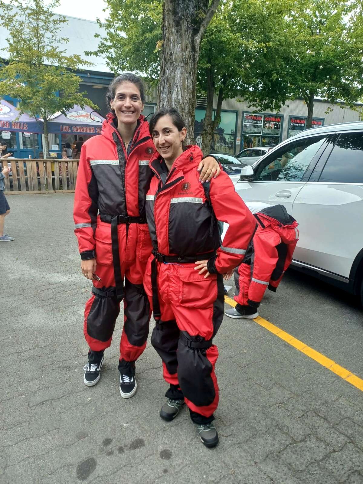 Por supuesto, cuando haces este tipo de actividades, nunca sabes lo que te vas a encontrar. Nosotros nos quedamos con las ganas de ver orcas, pero la experiencia con las ballenas fue preciosa. Después de subir y bajar a toda velocidad con los botes de la lancha sobre las olas, llegamos a un punto entre la costa de tierra firme y la de la Isla de Vancouver donde otros barcos habían avistado a una pareja de ballenas jorobadas. Estuvimos un buen rato con ellas, que aparecían y desaparecían a su antojo, unas veces más cerca y otras más lejos, exhalaban creando un géiser de agua marina sobre sus espaldas, nos mostraban su cola antes de sumergirse profundo… En un momento dado, cuando nos habíamos alejado tras otra pareja de ballenas, vimos desde lejos que ¡se habían puesto a saltar! Entonces, al ver que estaban juguetonas, nuestra guía dio la vuelta y volvimos con ellas. Poco a poco se fueron acercando más a nuestra zodiac. Llegó un punto en que las teníamos casi al alcance de la mano. Desaparecieron. Y, de repente, justo debajo de nosotros una gran burbuja delató a la ballena que había pasado por debajo de nosotros. «Bbbffffsscchh…» emergió a nuestro lado y exhaló, calándonos, como decía Ashley, de agua de mar y moco de ballena. Tres ballenas jugando a nuestro lado, mostrándose, saludando… Fue precioso.