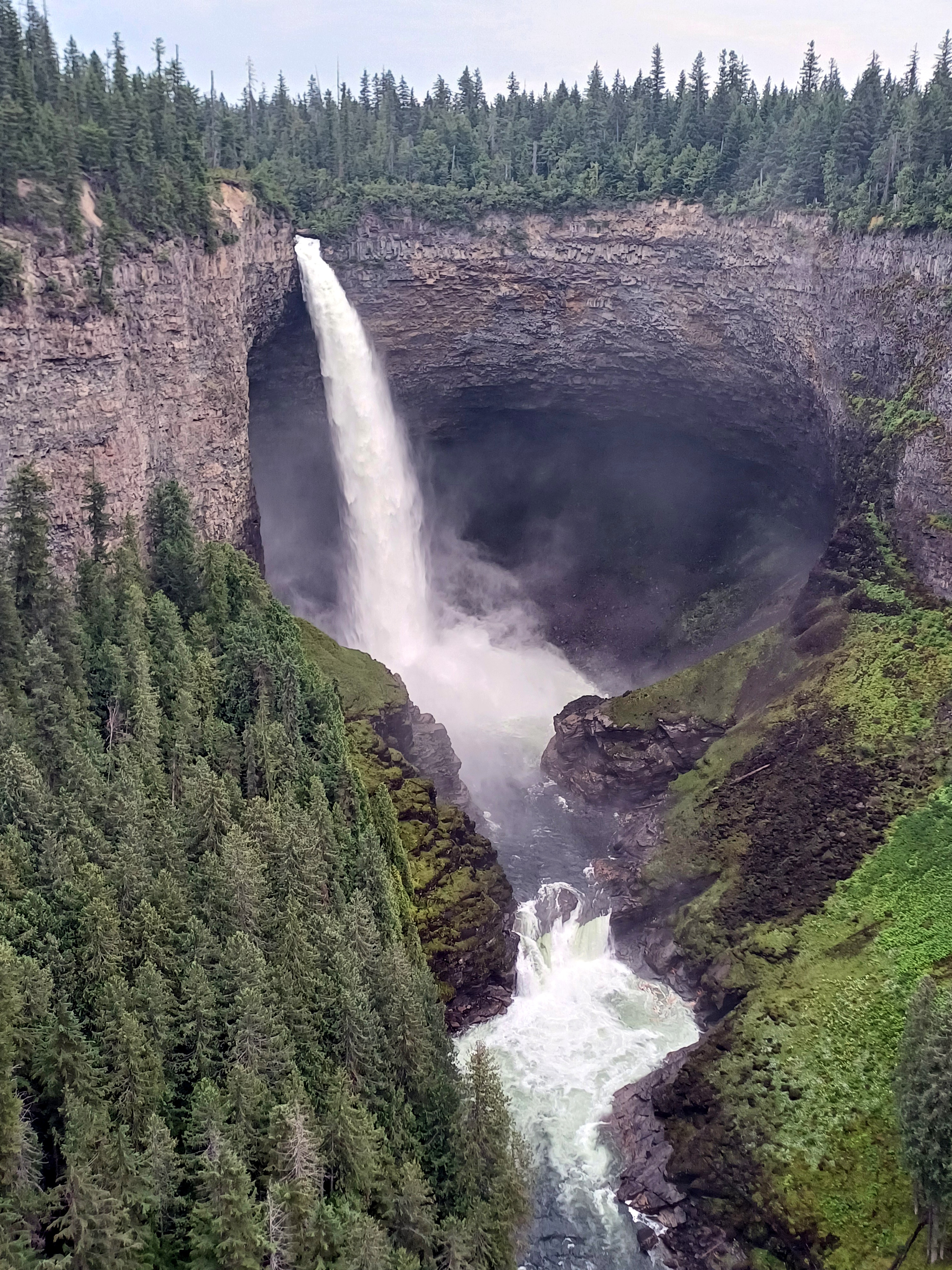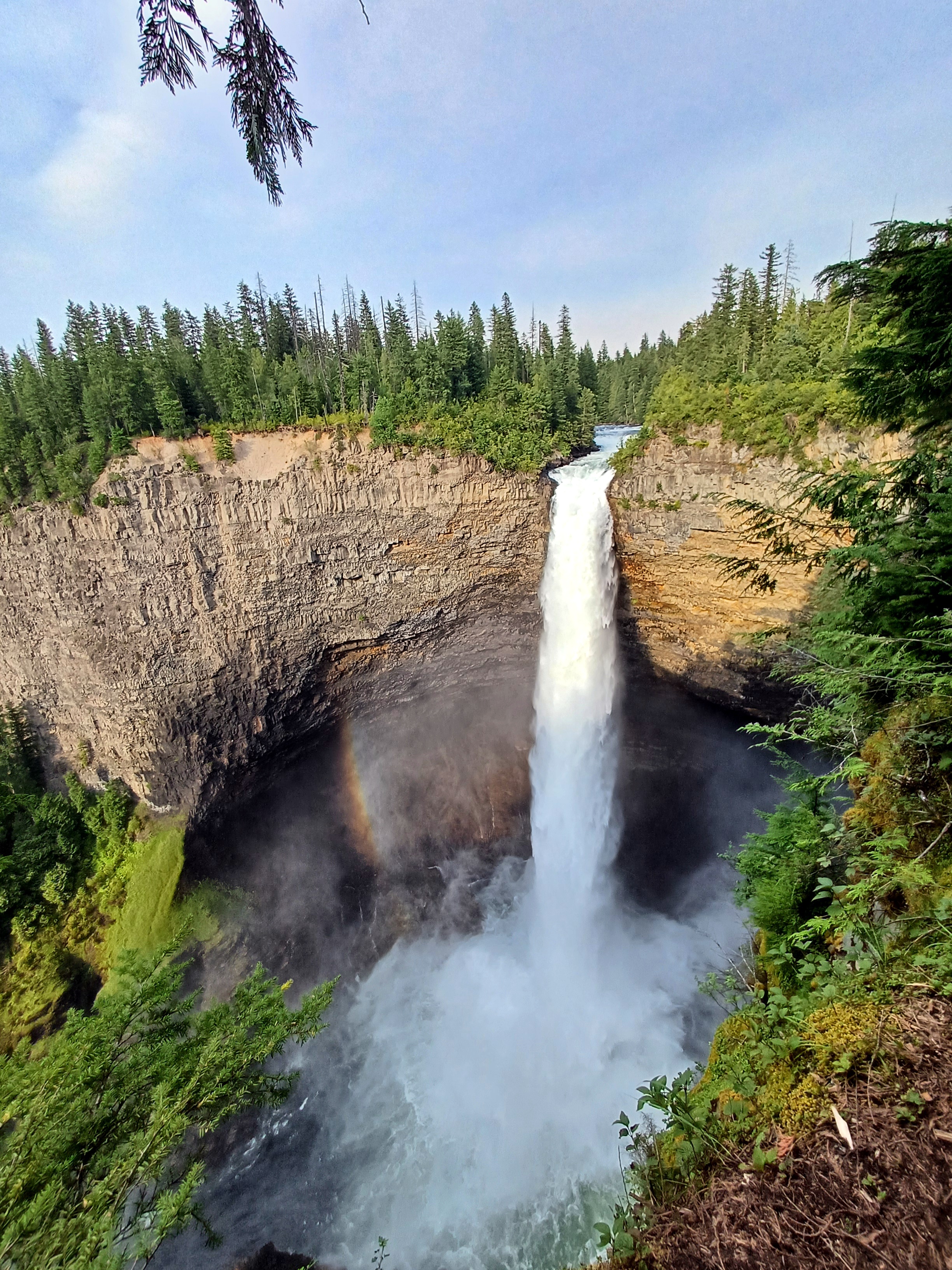 Ese río, que se iba volviendo cada vez más turbulento, llegaba finalmente a la cascada más impresionante que hayan visto nuestros ojos: Helmcken Falls. Esta cascada mide, nada más y nada menos que 141 metros de altura. Con la cantidad de agua que trae el ancho río (23 metros de ancho) y tal altura, no es difícil imaginar la fuerza brutal con la que el agua golpea la roca allá abajo. El sendero por el que habíamos llegado nos ubicaba junto a la cascada, desde arriba, haciéndonos asomar peligrosamente, entre los árboles del bosque, al amplio círculo glaciar de la roca que alberga la cascada. El río bajaba luego, muuuuy abajo, por un impresionante cañón. Como vimos que al otro lado del cañón había un mirador que enfocaba de frente a la cascada y al que se podía llegar en coche, decidimos acercarnos después también y, sin duda, mereció la pena, porque aunque el sendero permite avanzar junto al río hasta que cae y contagiarse de la magia de la naturaleza salvaje, las vistas más completas de la cascada y del cañón se ven desde el mirador de la orilla de enfrente.