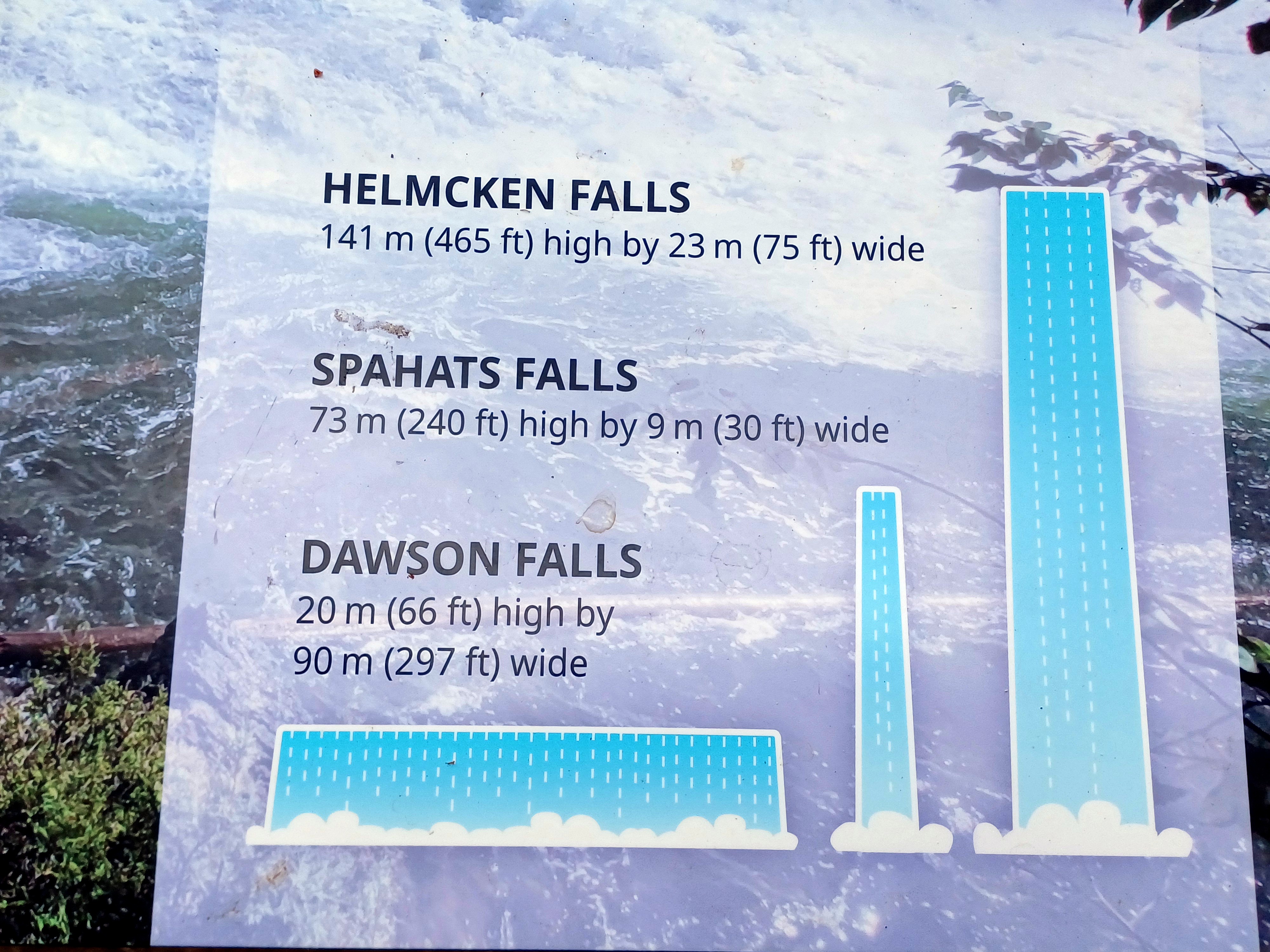 Las Dawson Falls son muy diferentes a las Helmcken Falls, aunque se trate del mismo río pues, en vez de altura, lo que tienen es anchura. No son tan hermosas como las Helmcken, pero merece la pena acercarse a verlas también porque la fuerza del agua de ese río es impresionante.