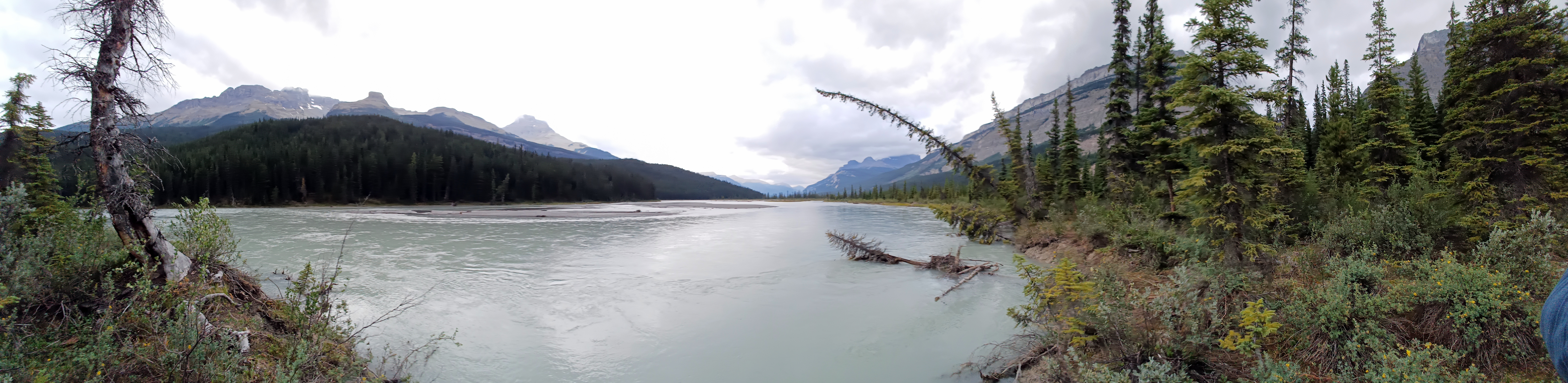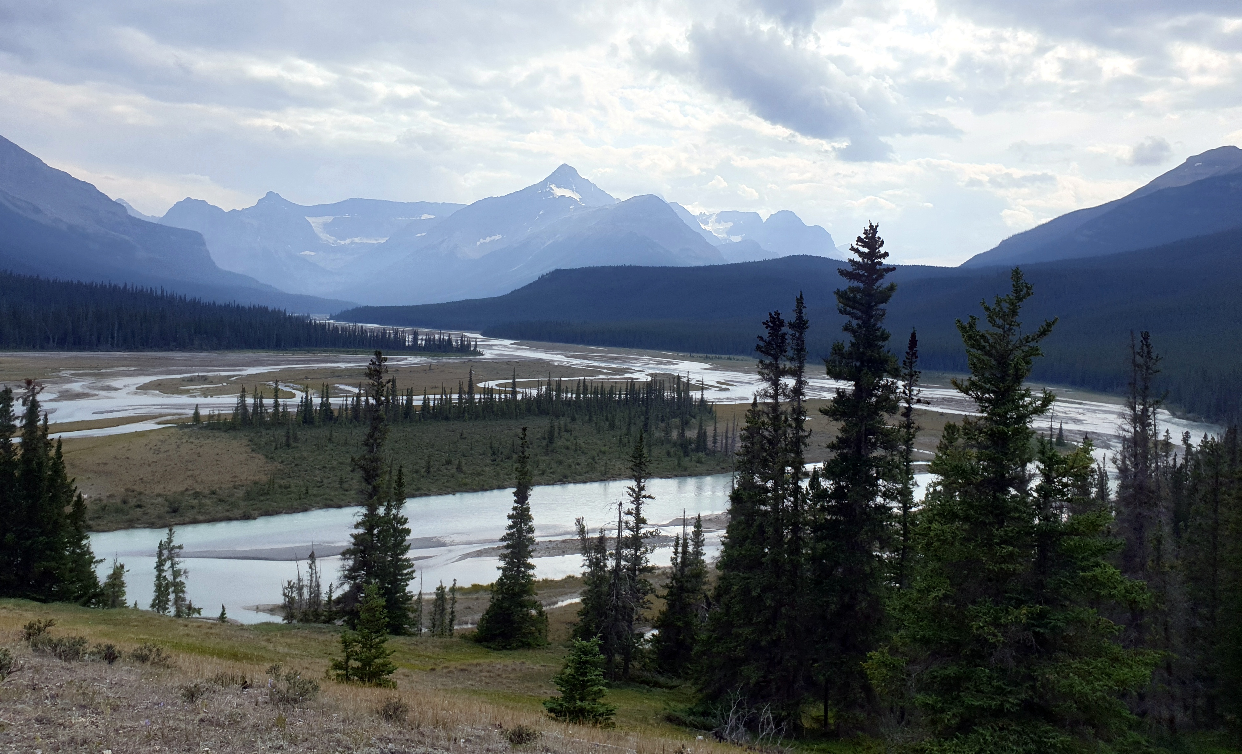 Icefields Parkway está ya en las Montañas Rocosas, entre Banff y Jasper. El camping que habíamos reservado allí era Rampart Creek y estaba ubicado 10 kms más allá del cruce de carreteras en el que el acceso a Jasper estaba cortado, por lo que no teníamos claro que nos fueran a dejar pasar. Afortunadamente, al enseñarles la reserva, nos dejaron acceder. La carretera, que ya venía siendo impresionante desde hacía un buen rato, con altas montañas rocosas plagadas de profundos glaciares que asomaban hacia abajo, junto a lagos turquesas y frondosos bosques de abetos, ahora, al acercarnos al camping, era toda para nosotros.