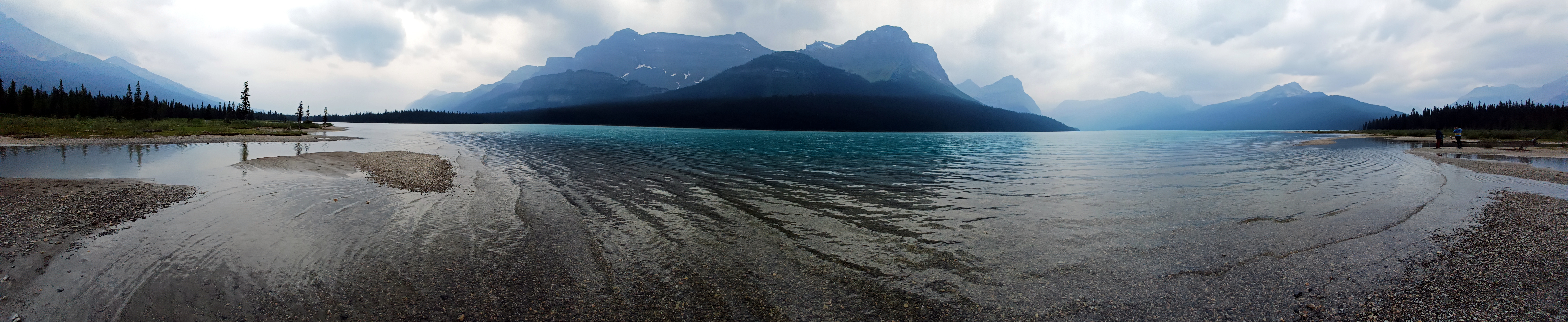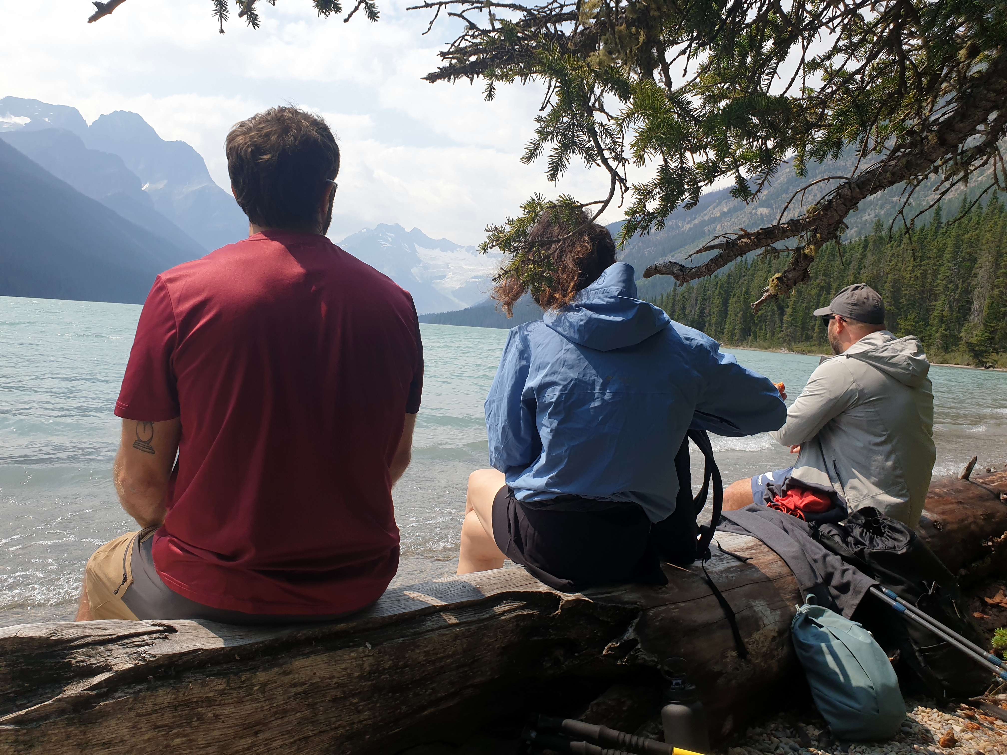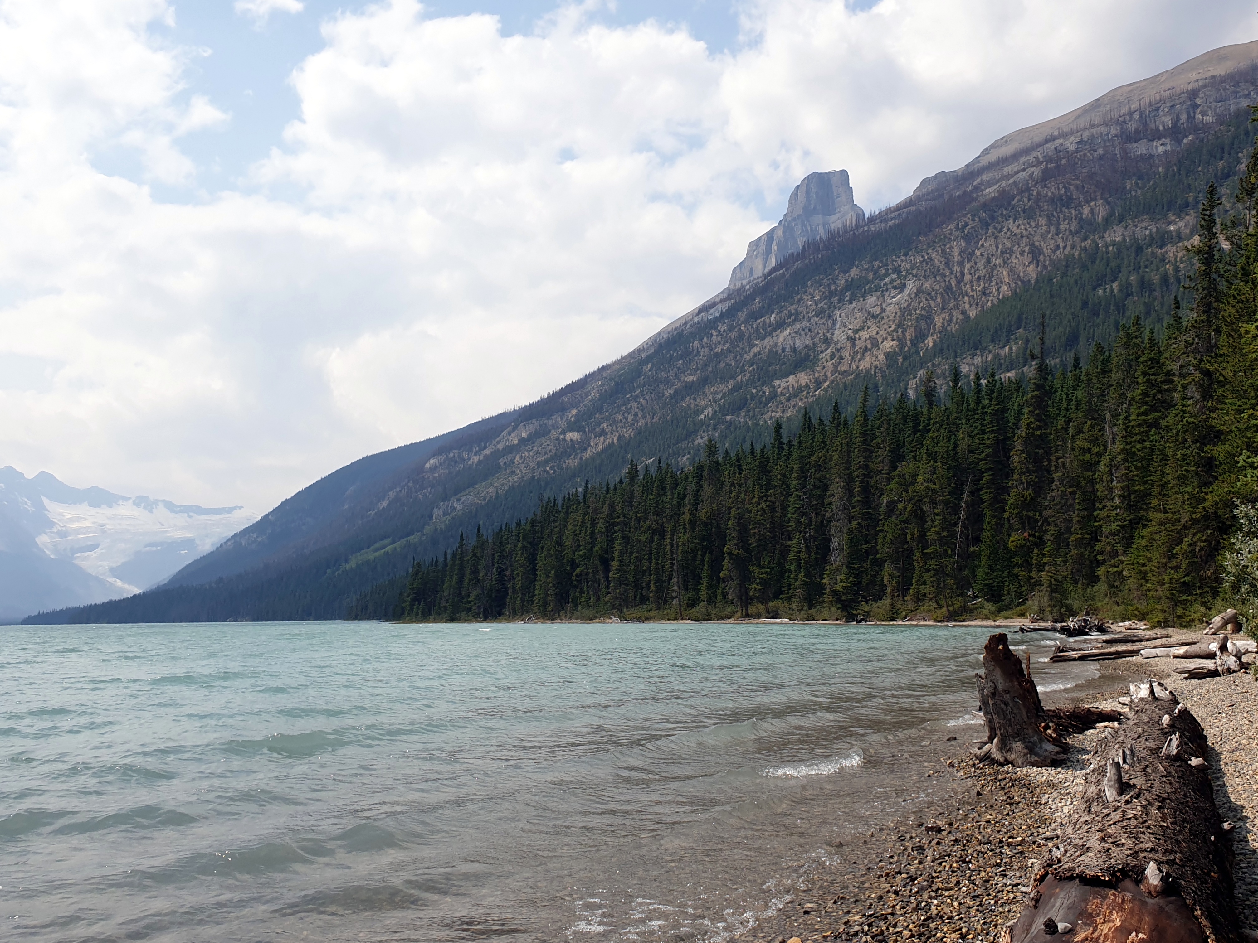 La excursión nos llevó 4 horas y media, subiendo y bajando por un tupido bosque que, aunque sin duda bonito, no era tan especial como los que habíamos visto en otros paseos. En el bosque, tranquilo, además del viento solo se oía el crujir de la madera de los altos árboles que se balanceaban y los gritos de algunas ardillas. Al poco de empezar el camino, se llega a un punto alto desde el que se observan los meandros del río Saskatchewan, con sus islotes arenosos, sus aguas lechosas, el bosque, las montañas al fondo… El típico paisaje que uno esperaría encontrarse en las Rocosas. Al final de la ruta llegamos al lago. Apareció de repente, sin apenas orilla al salir del bosque y con sus olas rompiendo contra los guijarros que conforman la estrecha orilla que lo rodea. Al fondo, como era de esperar, el glaciar que le da de beber, encaramado a un alto pico. Soplaba bastante viento, pero como salió el sol, estuvimos un buen rato allí muy a gusto comiendo, tomando el sol y disfrutando de las vistas y la soledad en medio de aquel rincón del mundo.