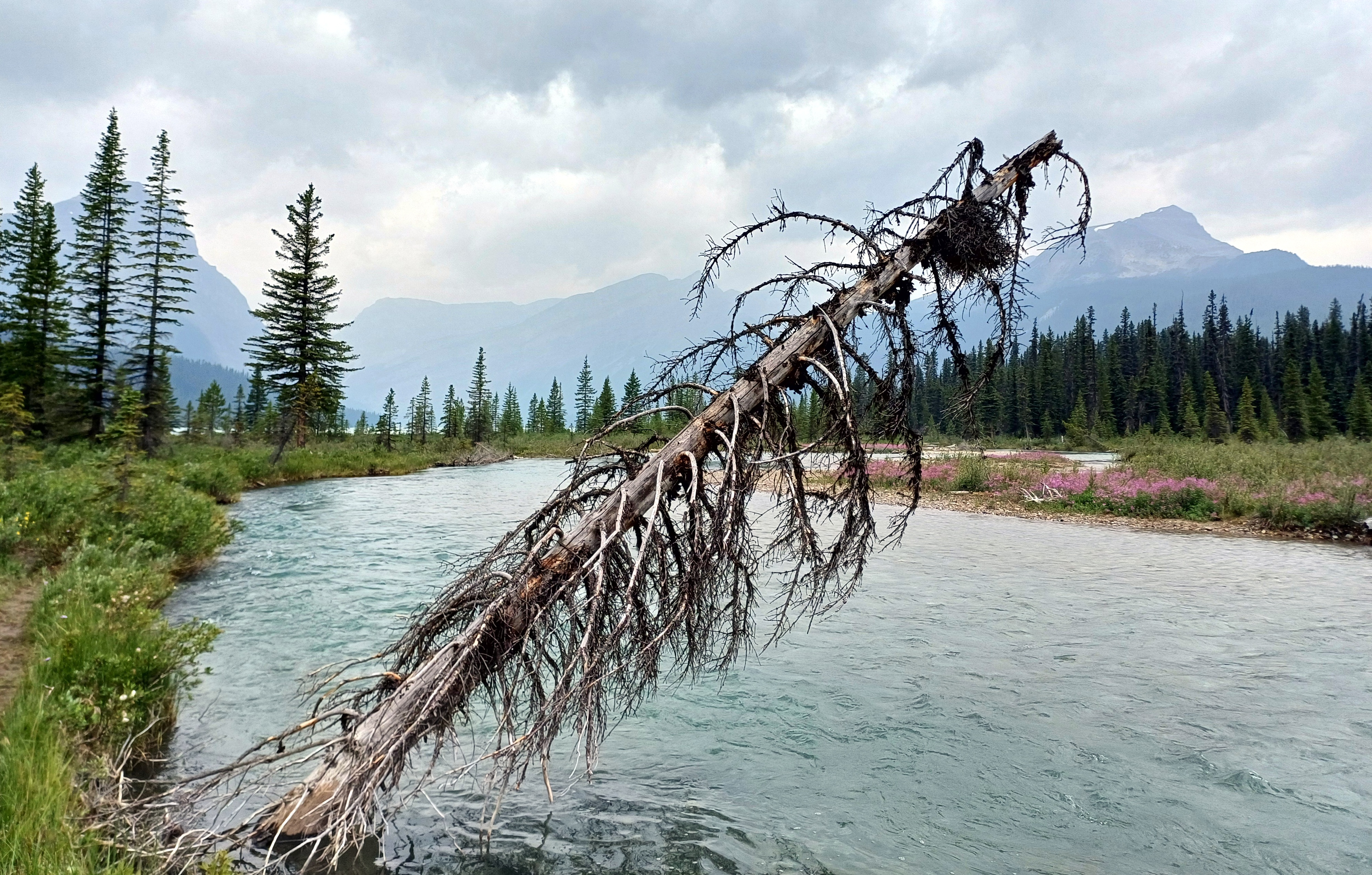Al llegar a Rampart Creek, que era una zona de bosque bajo junto a un río, vimos que mucha gente había cancelado sus reservas, porque estaba prácticamente vacío. El camping era muy precario, sin siquiera duchas ni posibilidad de vaciar ni llenar las aguas de la caravana. Como ya no quedaba mucha tarde, dimos un paseíto tímido junto al río. Digo tímido porque habíamos visto un cartel en el que avisaban de la presencia de un oso que merodeaba esos días por el camping en busca de comida. Afortunadamente, no tuvimos ningún encuentro indeseable con él.