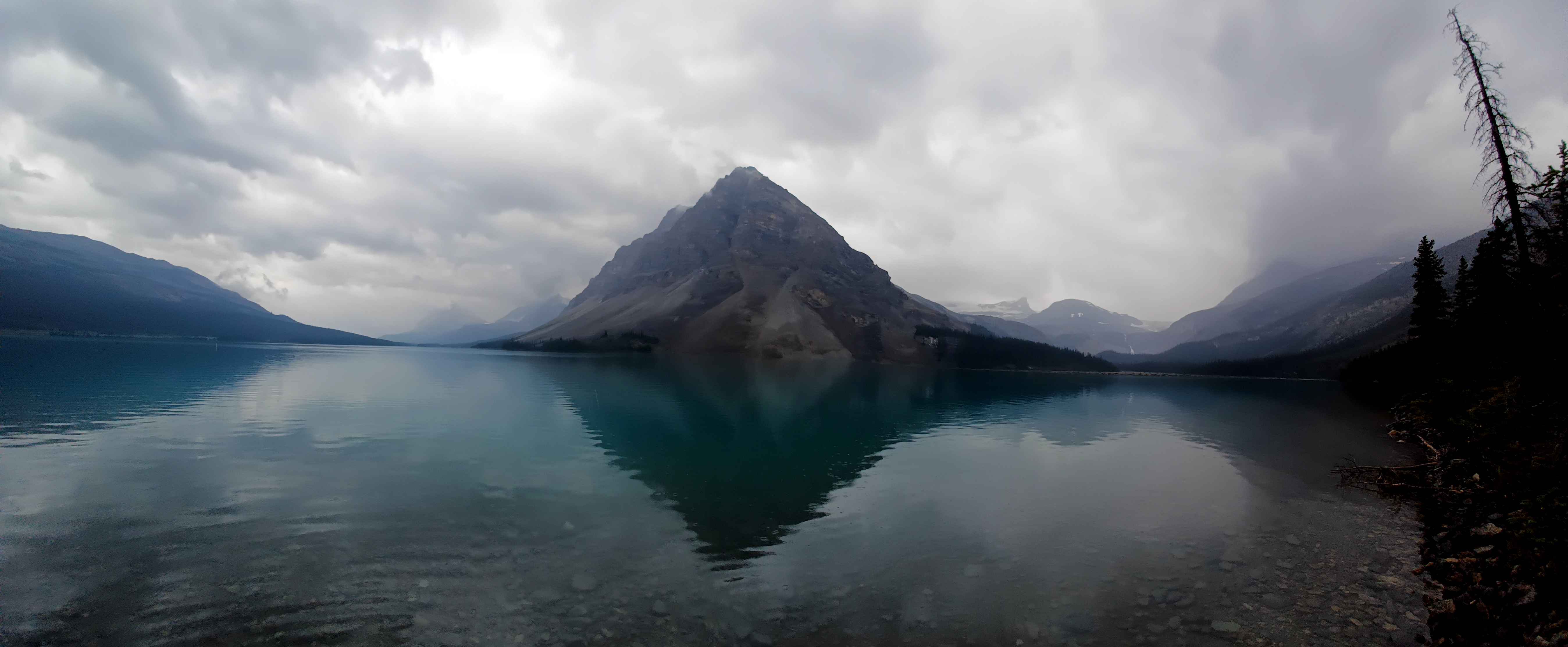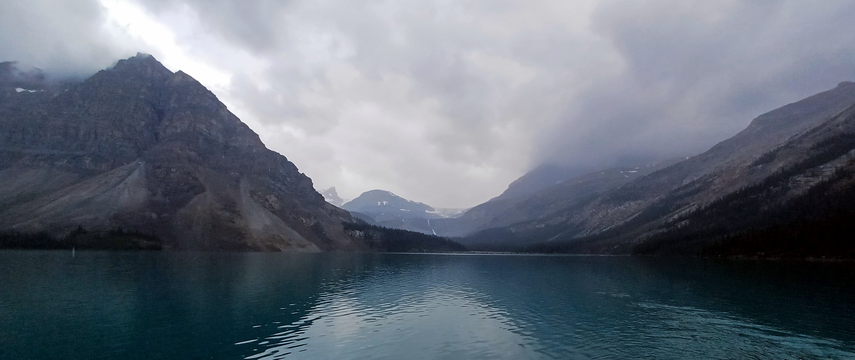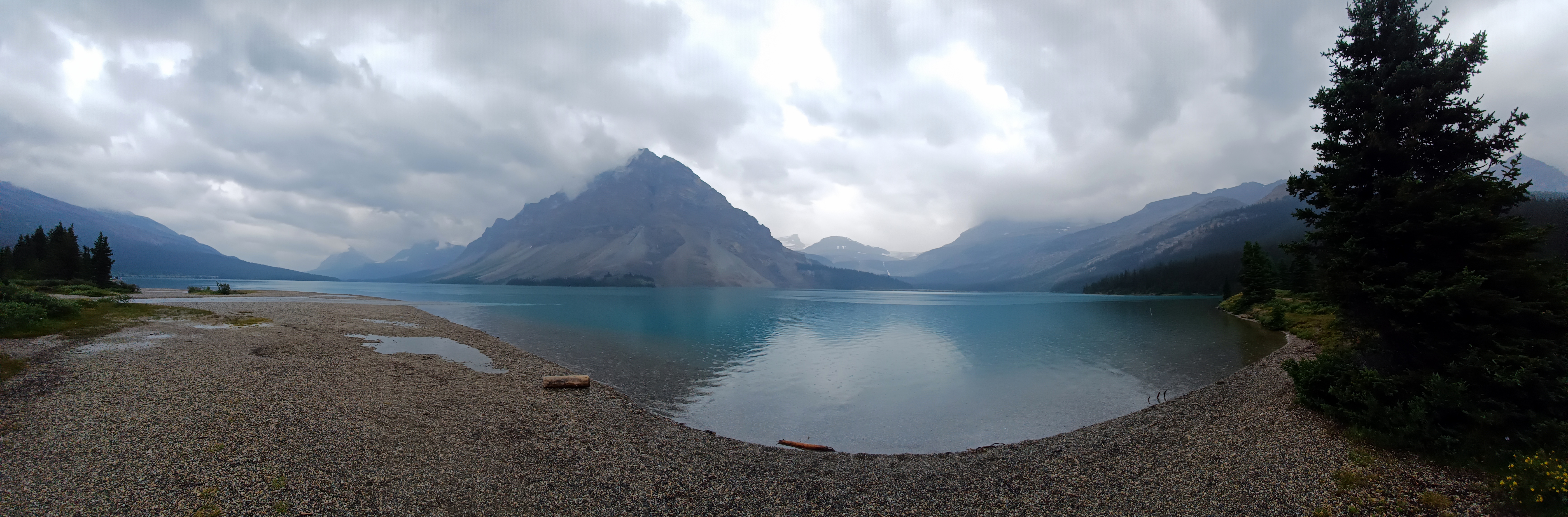 Cansados después de la excursión, fuimos al Bow Lake, donde había mucha gente, un hotel en construcción, una cafetería y una zona de picnic junto al precioso lago. Como llovía comimos dentro de la caravana, en el parking. Pero después, cuando la lluvia había aflojado un poco, salimos a pasear. Y vaya maravilla… el lago era muy similar al Hector Lake, con unas aguas calmadas que, de haber hecho buen tiempo, habrían invitado a bañarse en ellas. Desde allí vimos que salía una ruta con muy buena pinta hacia una cascada a los pies de un glaciar (tanto la cascada como el glaciar se podían ver desde donde estábamos). Pero duraba casi 5 horas y, como había unas nubes con no muy buena pinta echándose sobre el lago y era quizás ya un poco tarde para ponerse con una excursión de esa longitud, desechamos la idea, pero nos quedamos con las ganas y anduvimos un rato bordeando el lago por lo que habría sido el inicio de esa ruta.