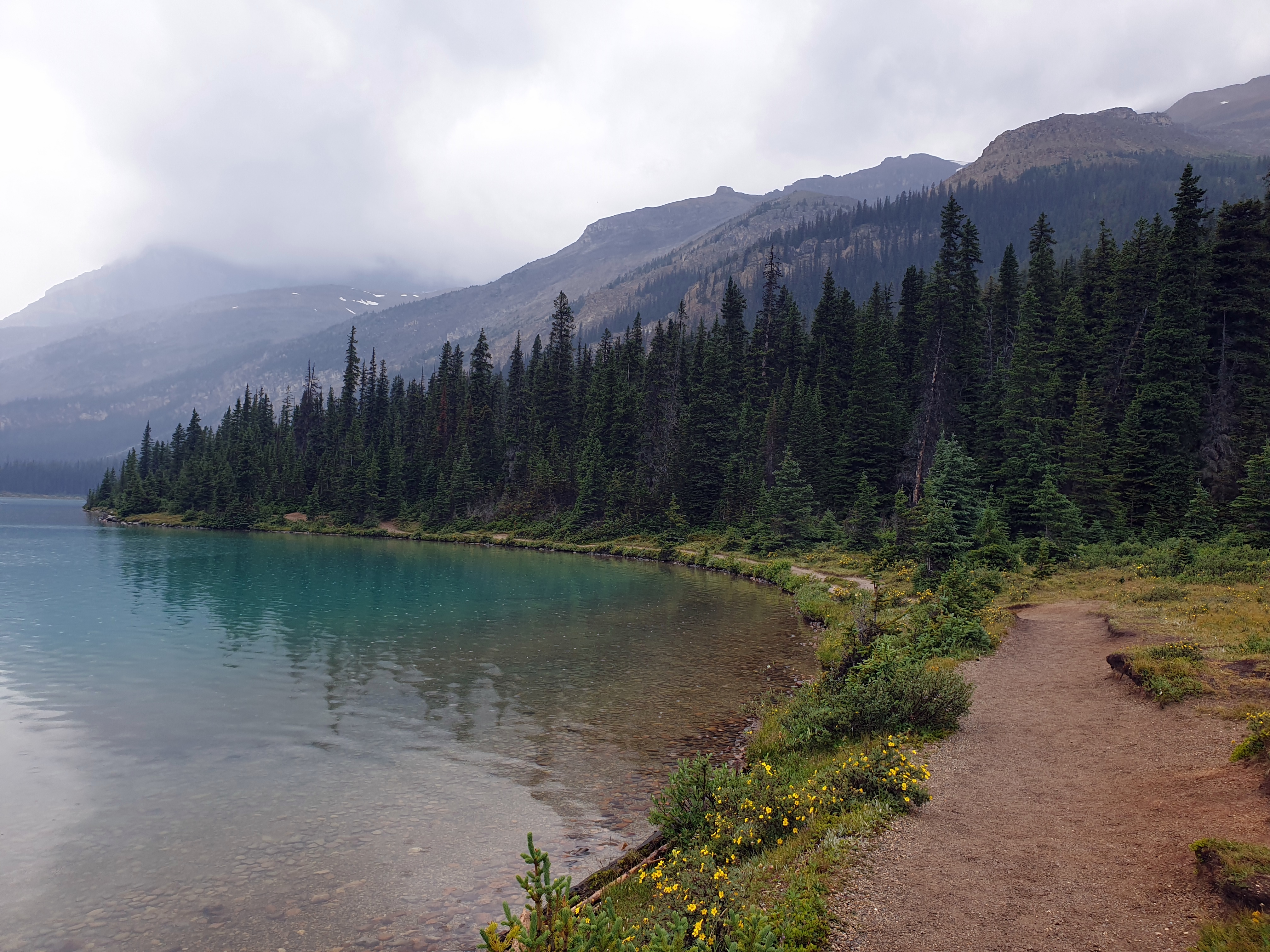 Seguimos bajando hasta la altura de Hector Lake y allí tomamos un sendero para llegar hasta el lago. La caminata transcurría por unos senderos llenos de barro y, más adelante, junto a un río que, cada vez más ancho, se ramificaba, obligándote a sortear sus aguas. Al final, tras unos 40 minutos, llegamos a las orillas lisas de un precioso lago que se extendía a ras de suelo como una piscina infinita de aguas calmadas, con altas montañas guardando uno de sus costados. La verdad es que, al estar solos y con la calma que otorgan la lluvia fina y las nubes bajas, el panorama era de lo más relajante, a pesar de que el camino no hubiera sido ni el más cómodo ni el más bonito.