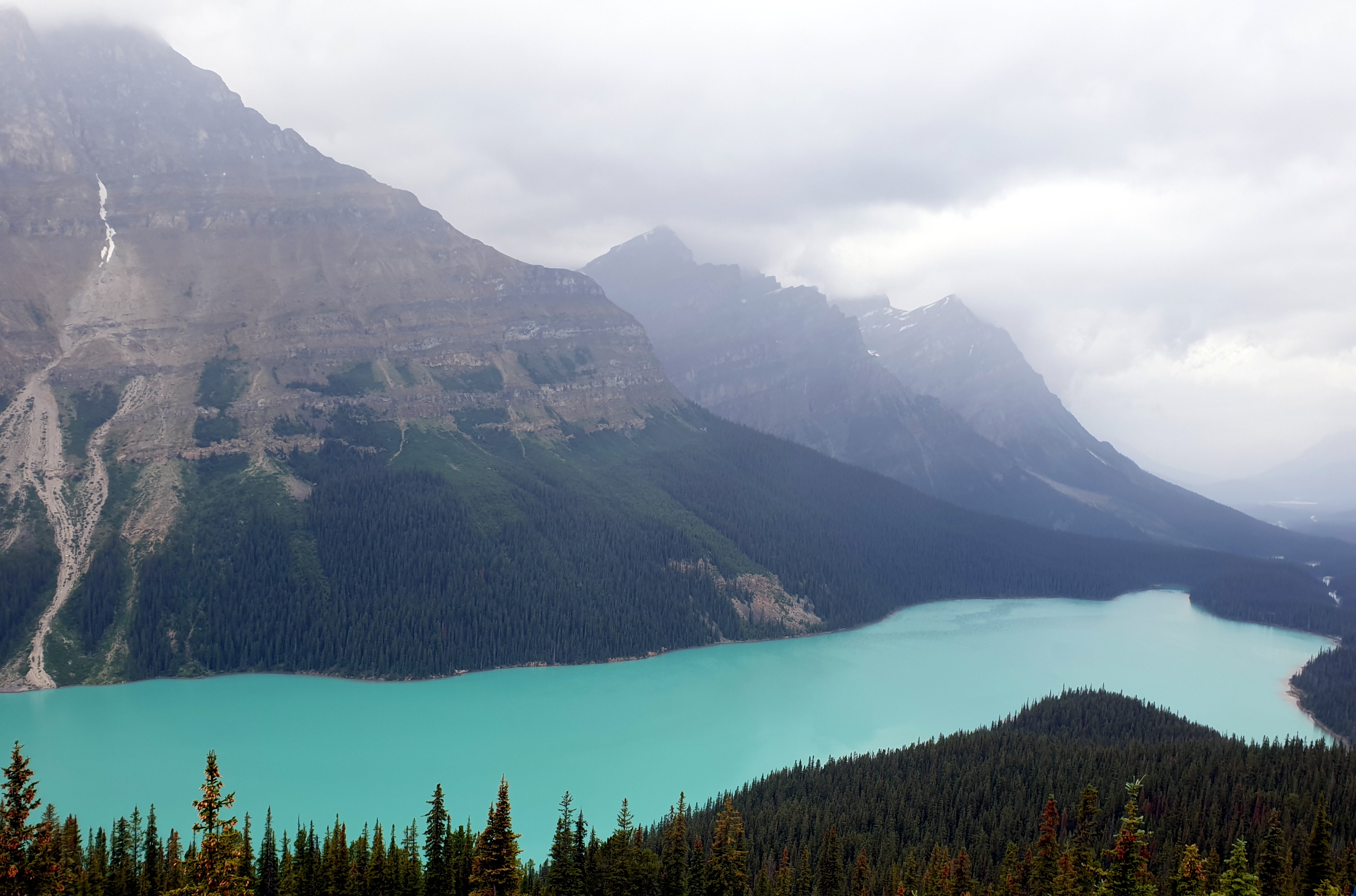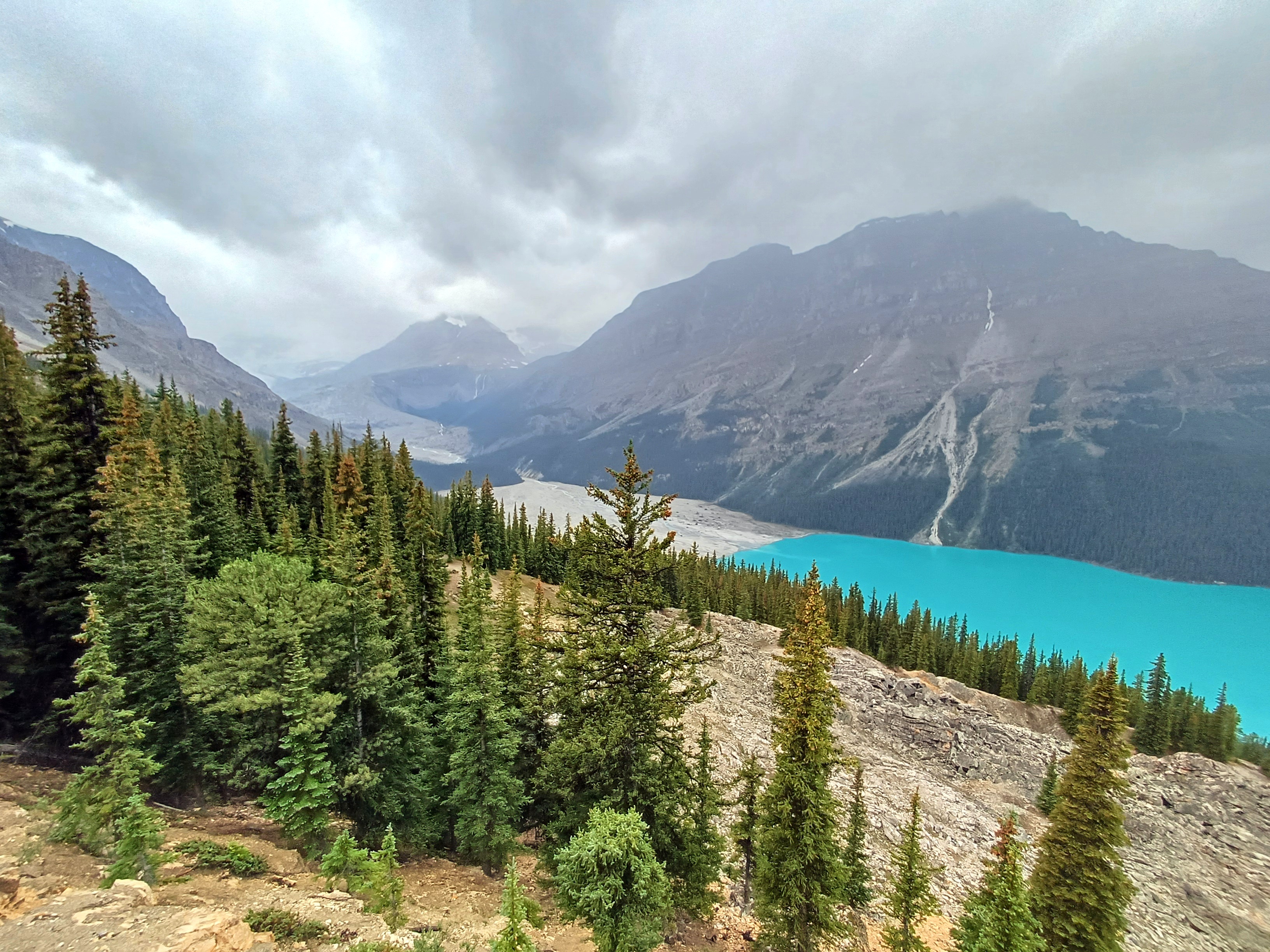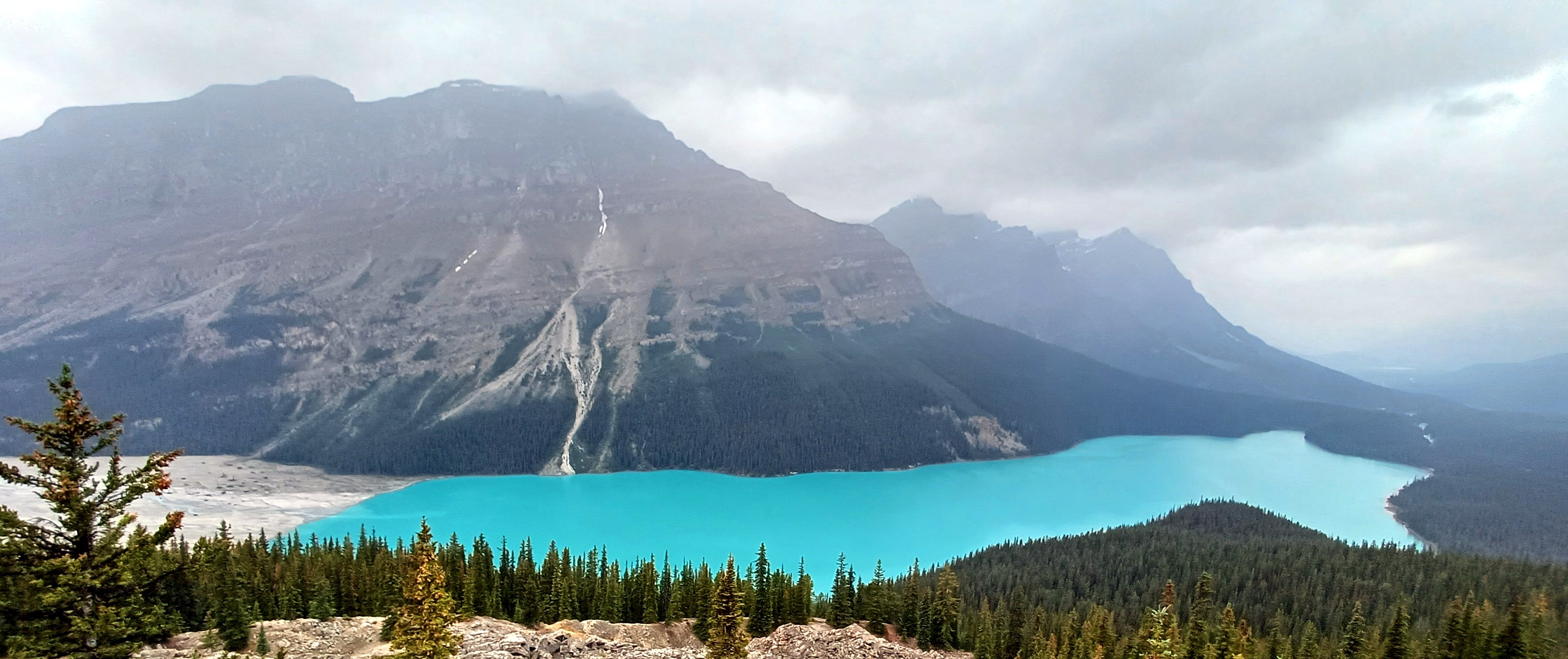 En fin, el lago Peyto es uno de esos lagos con unas aguas de un sorprendente azul turquesa. Desde el mirador al que accede todo el mundo se puede ver, a la izquierda, el río pastoso que transcurre por unas tierras barrosas blancas, procedente de un glaciar encaramado a las rocas de la montaña que ha ido retrocediendo con el paso de los años (antes llegaba hasta el propio lago). Para llegar a este mirador está todo muy preparado: hay un gran parking y han pavimentado un sendero que atraviesa hacia arriba un bosque muy bonito de pequeños abetos y flores de colores. Hay que andar poco, aunque sea una cuesta muy empinada.