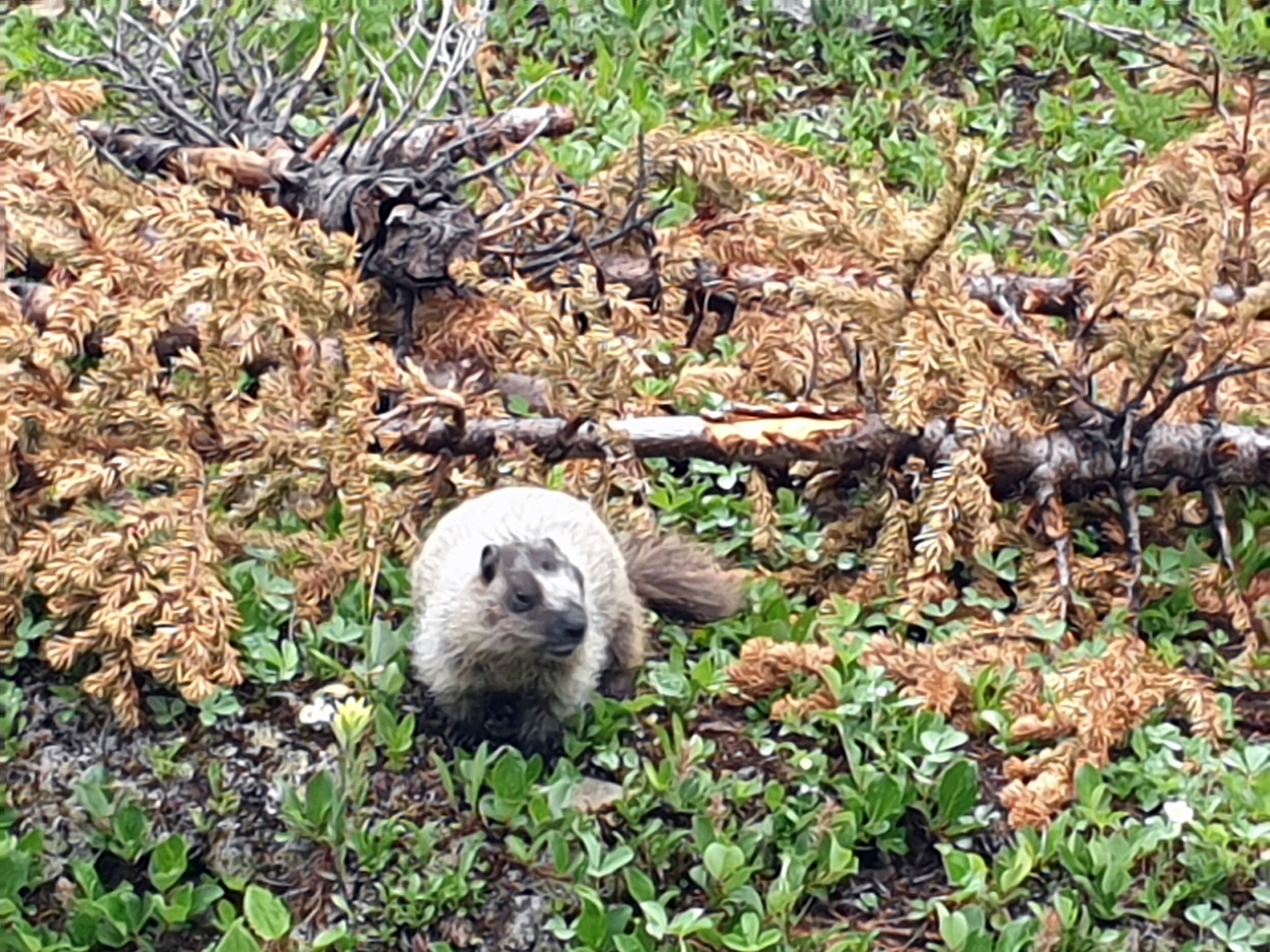 Desde el mirador del lago Peyto parte otro sendero que, en aproximadamente 1 hora, sube a un mirador sobre el lago Bow. El paseo es bonito en cuanto que el bosque, como hasta el mirador del lago de Peyto, es muy agradable y porque demás, como ganas mucha altura, te acercas a los picos rocosos de la montaña y ves desde las alturas el valle por el que transcurre la carretera. Además, ya cerca de la cima, es increíble la cantidad de marmotas confiadas que se pasean a tu lado sin temor ninguno. Sin embargo, al llegar al final del camino, el lago Bow queda todavía lejos y, aunque se ve, no son las vistas que imaginábamos. Por lo tanto, a no ser que realmente te apetezca mucho hacer ejercicio y andar cuesta arriba, no merece mucho la pena la caminata.