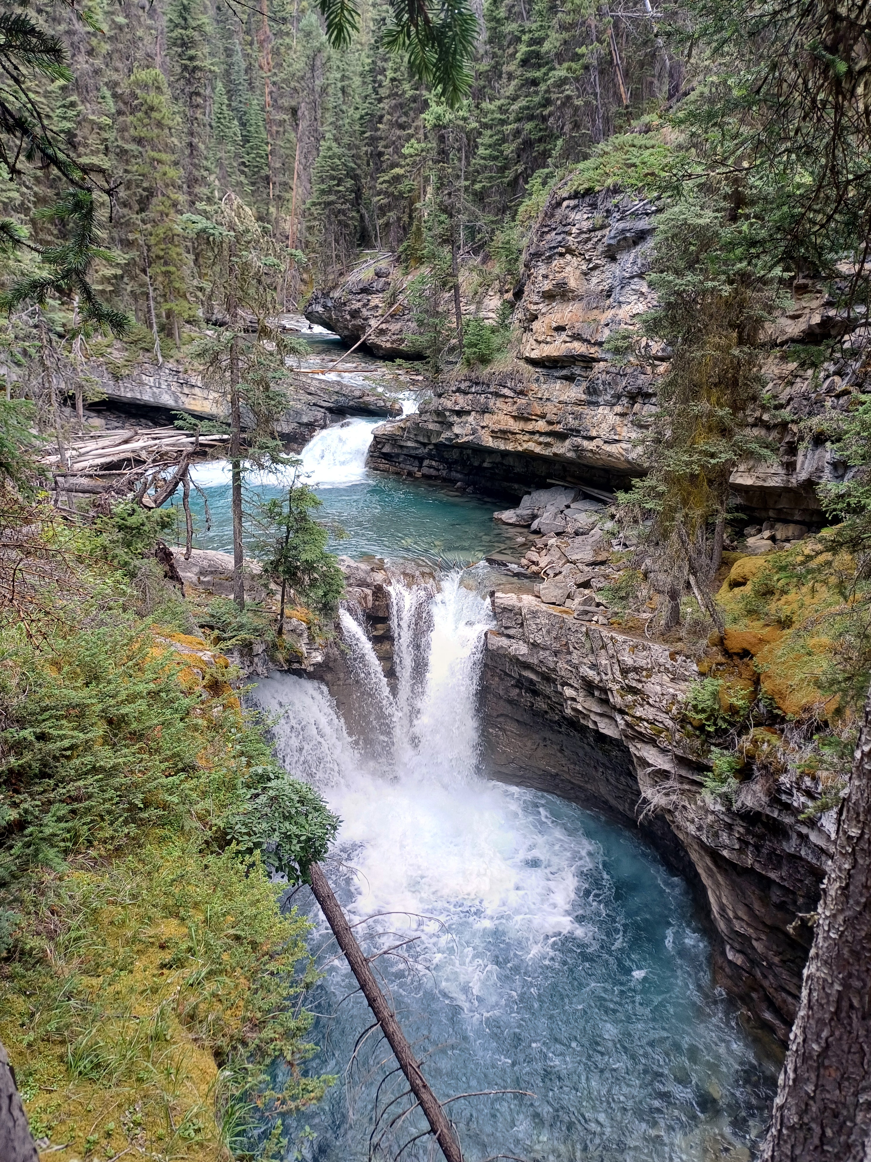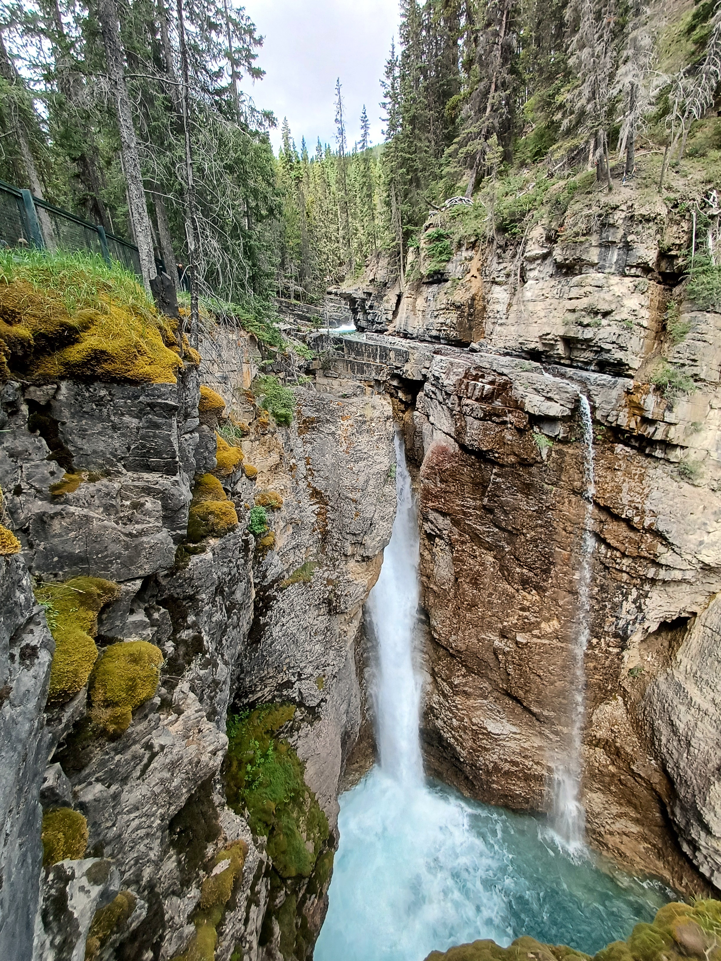 Más adelante, bajamos en Johnston Canyon. Aquí nos dimos cuenta de lo realmente turística que era esta zona. Había varios parkings y ya poco espacio para estacionar y, en cuanto empezamos a andar por las pasarelas colgantes que han puesto en el cañón, sufrimos los efectos del turismo accesible… Es uno de estos recorridos que haces prácticamente en fila y, si te quieres hacer fotos con las cascadas, entonces tienes que hacer fila, literalmente. De hecho, para bajar a fotografiarte junto a una de las cascadas del cañón (la de abajo, ya sabemos que siempre hay menos gente que sube hasta arriba) había una larga cola que no sabemos cuánto rato podría durar, pero seguro que mucho… En fin, el camino, que va subiendo entre el bosque y el río durante unos 40 minutos de caminata, en nuestra opinión no merece mucho la pena por lo incómodo de moverte entre tanta gente. Además, el cañón en sí era bonito, pero quizás el que menos nos gustó de todos los que habíamos visto.