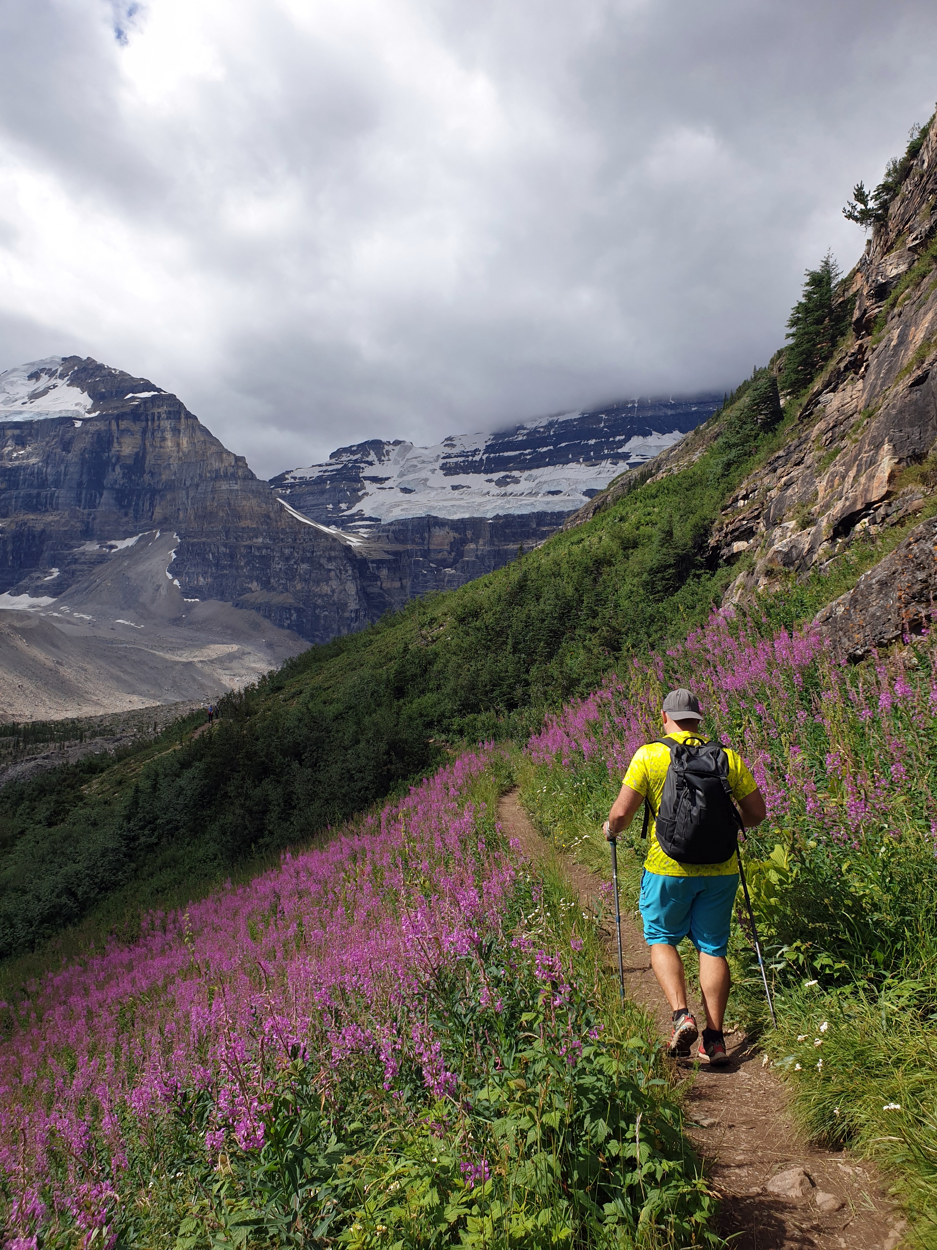 Nosotros hicimos una excursión larga de unas 6 horas (previsión en marcha), en la que atravesando el bosque subimos a dos pequeños lagos que hay sobre el Lake Louise: el diminuto Mirror Lake, a los pies de un gran peñasco llamado Big Beehive (por el parecido que tiene con una colmena); y el Lake Agnes, algo más grande y con aguas de un azul profundo. Junto al Lake Agnes, hay una cabaña-bar (la Tea House) para la que había que hacer fila si querías tomarte algo. Después, el camino continuó, primero montaña arriba para, desde lo alto del Beehive, poder contemplar el Lake Louise y su ajetreo desde las alturas y, después, montaña abajo, para llegar hasta la planicie a los pies de los glaciares que nutren el lago, sacando de sí, gota a gota, un río de aguas lechosas. La excursión finalizaba bordeando tranquilamente el lago y culminamos la larga caminata con un fresquito baño en las aguas del lago.