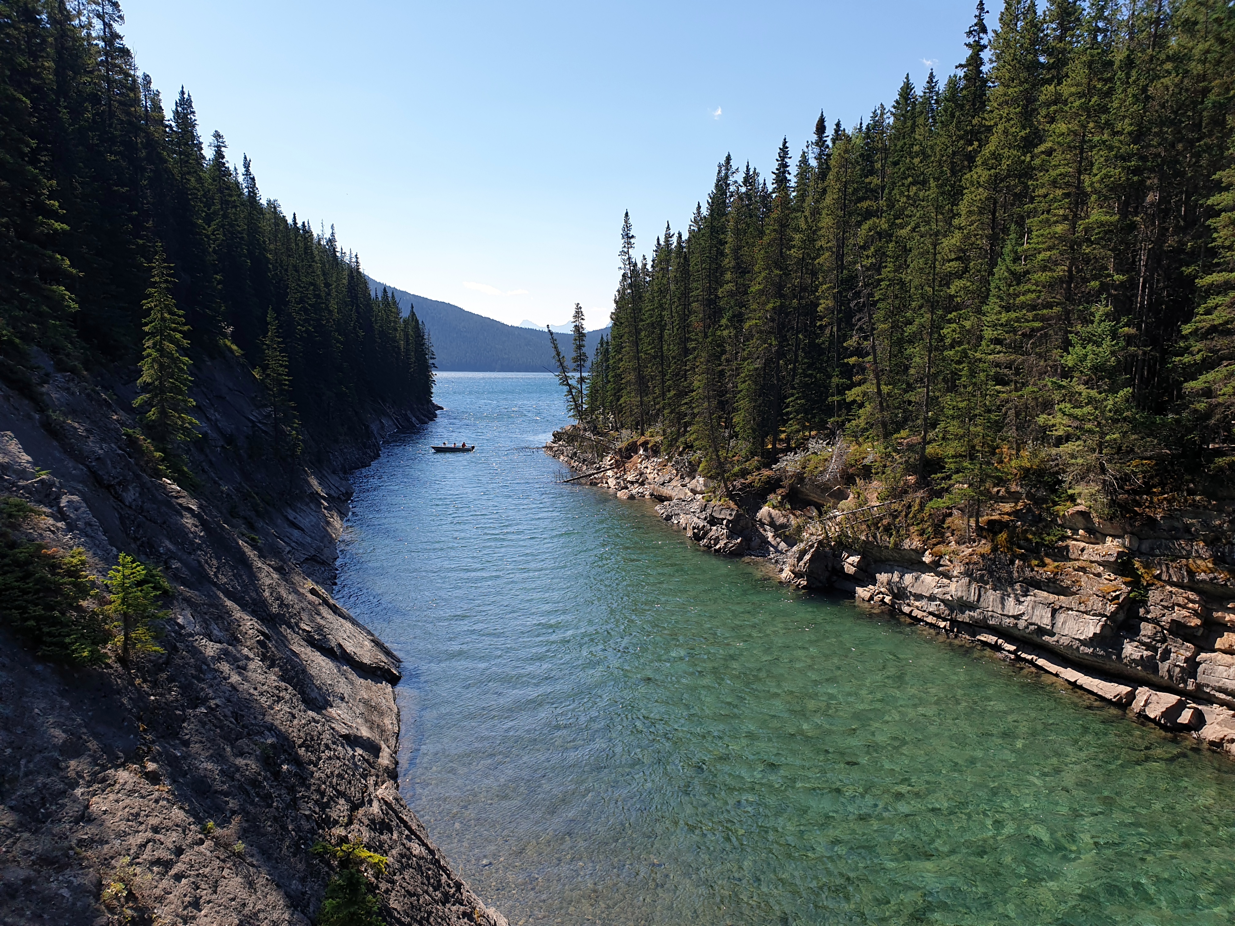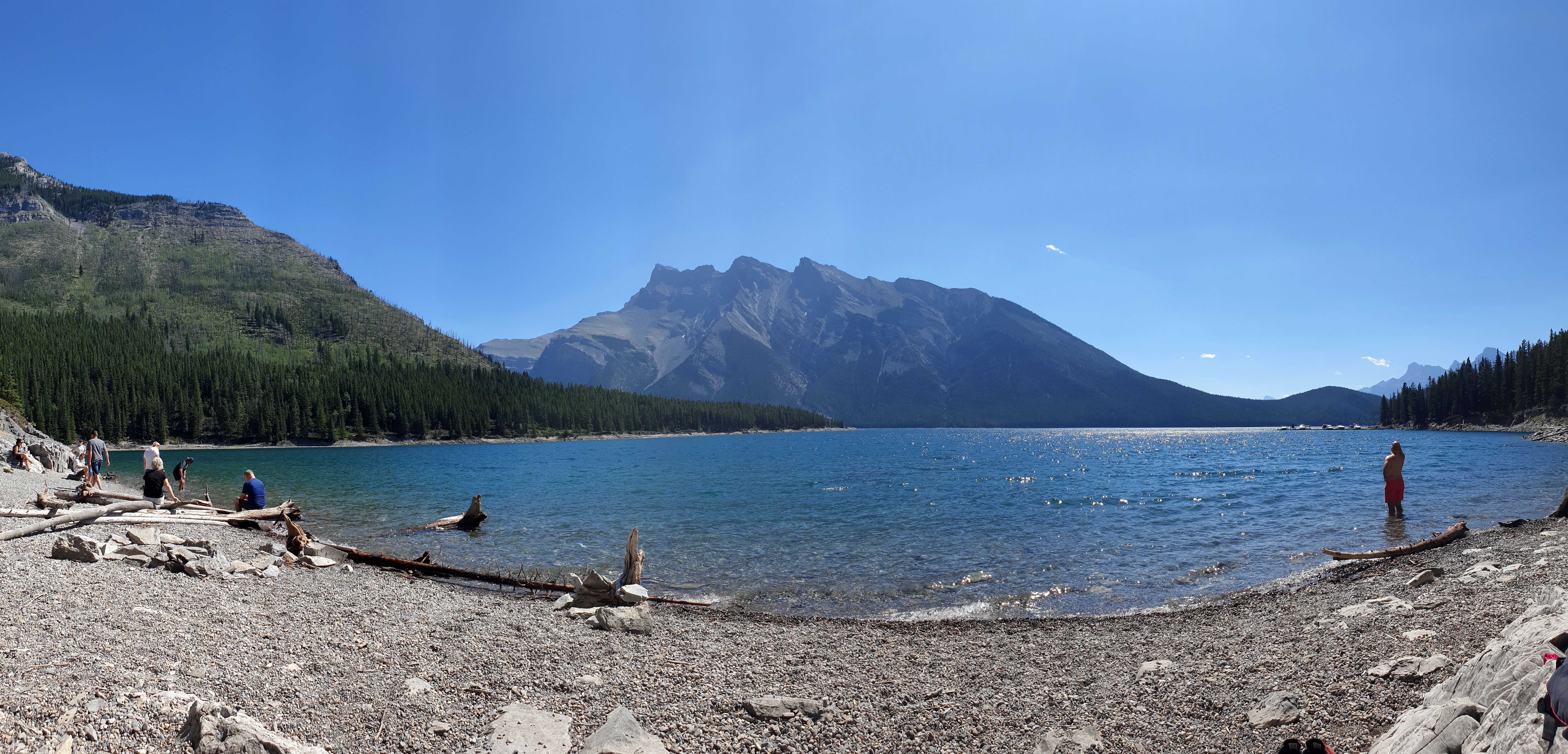 Al día siguiente, que salió por fin bien soleado, fuimos a ver el lago Minnewanka. Este lago, según cuentan los indígenas, tiene sus propios espíritus acuáticos. Nosotros, afortunadamente, no nos cruzamos con ninguno. Algo con lo que sí debía de ser bastante posible cruzarse eran los osos, porque nada más llegar te avisaban de ello con carteles por todas partes, indicándote las zonas por las que se había restringido el paso. Este lago no tiene las aguas del color de los anteriores, pero es muy bonito y transparente. Hay varias zonas para hacer picnic y se pueden alquilar también canoas y dar un paseo en barco por él, ya que es enorme. Aunque solo vimos una pequeña parte del lago (hay una ruta circular que rodea el lago), porque no estábamos demasiado cómodos paseando por el bosque sabiendo que había «alerta por osos» y creímos que valía más la pena aprovechar el tiempo descansando y dándonos un bañito. Vimos varias playitas de rocas, estupendas para darse un baño, así que después de andar un rato, paramos en una de ellas y aprovechamos el maravilloso sol para darnos unos baños en las gélidas aguas del Minnewanka.