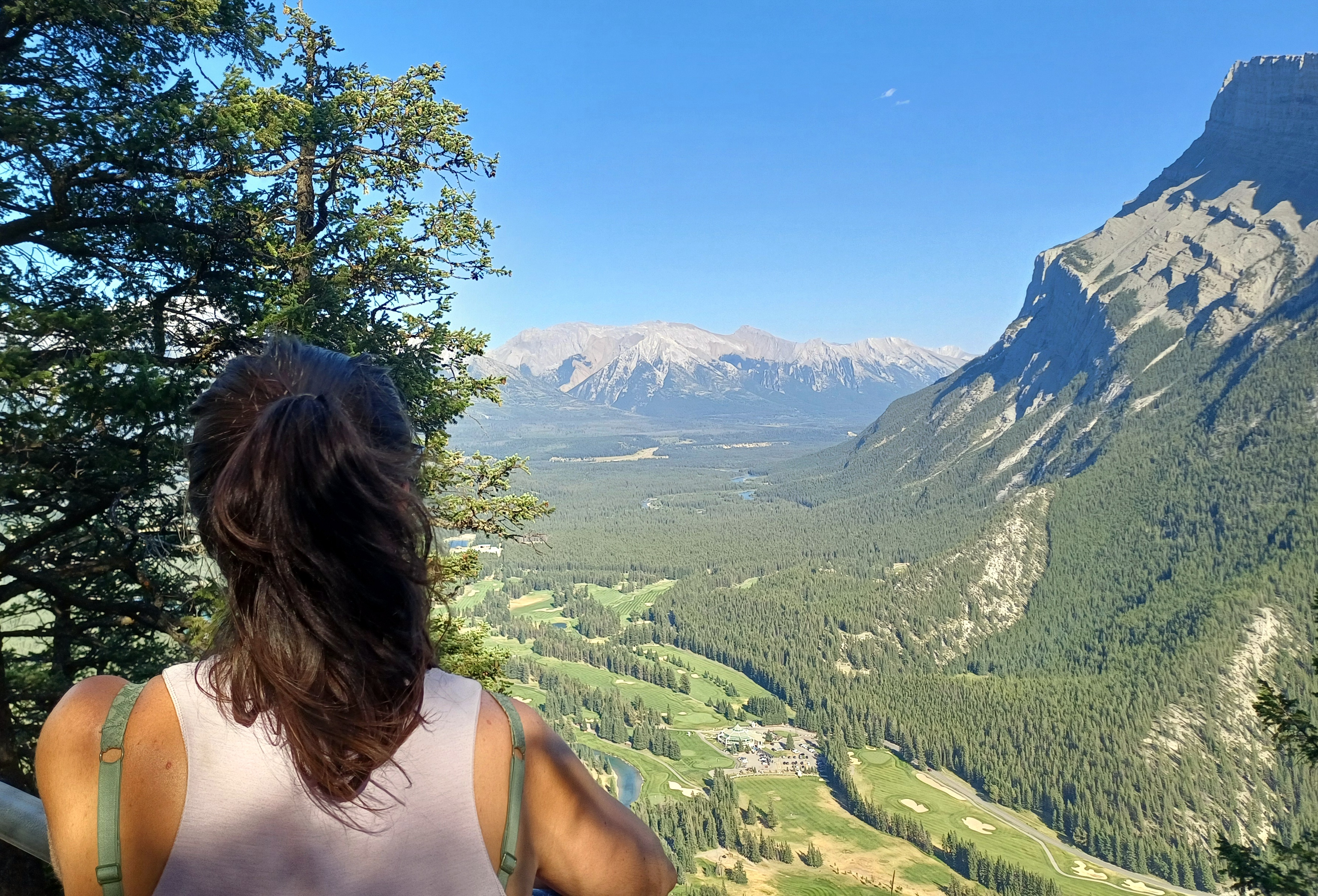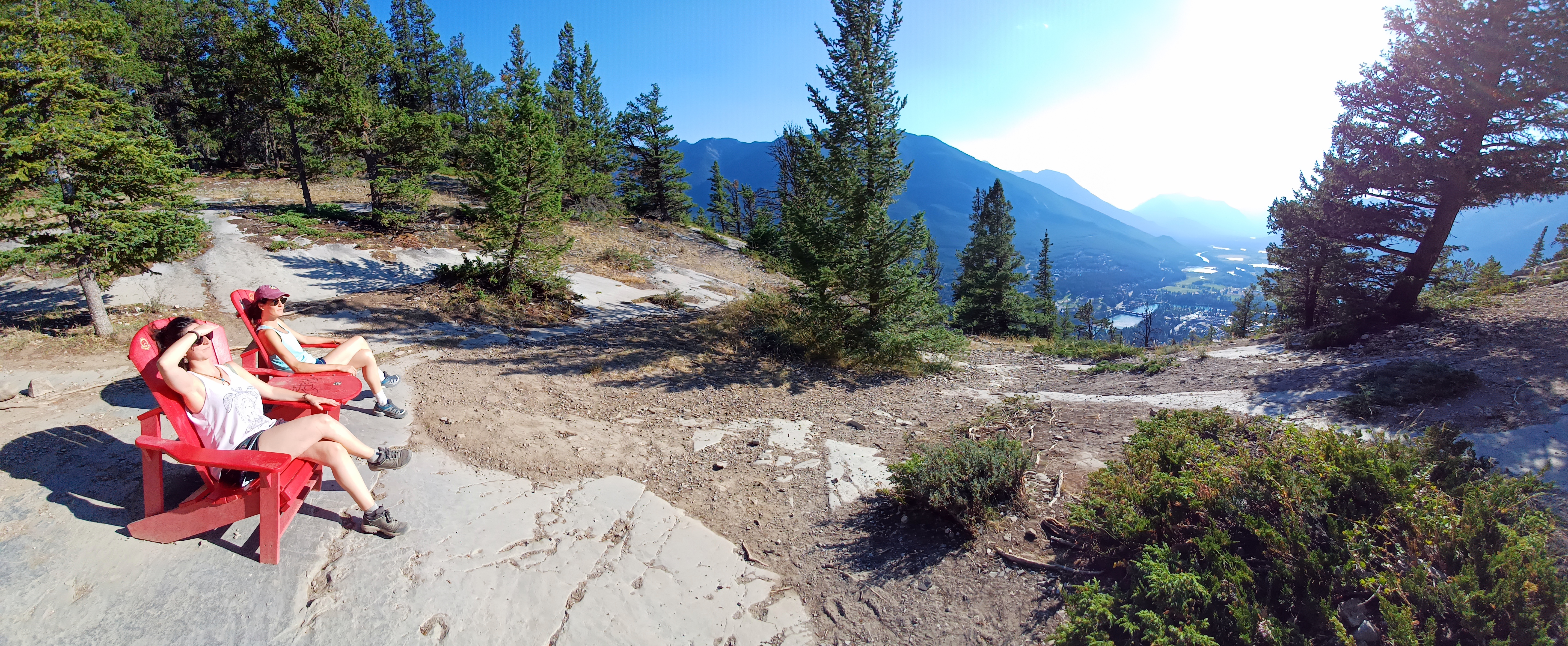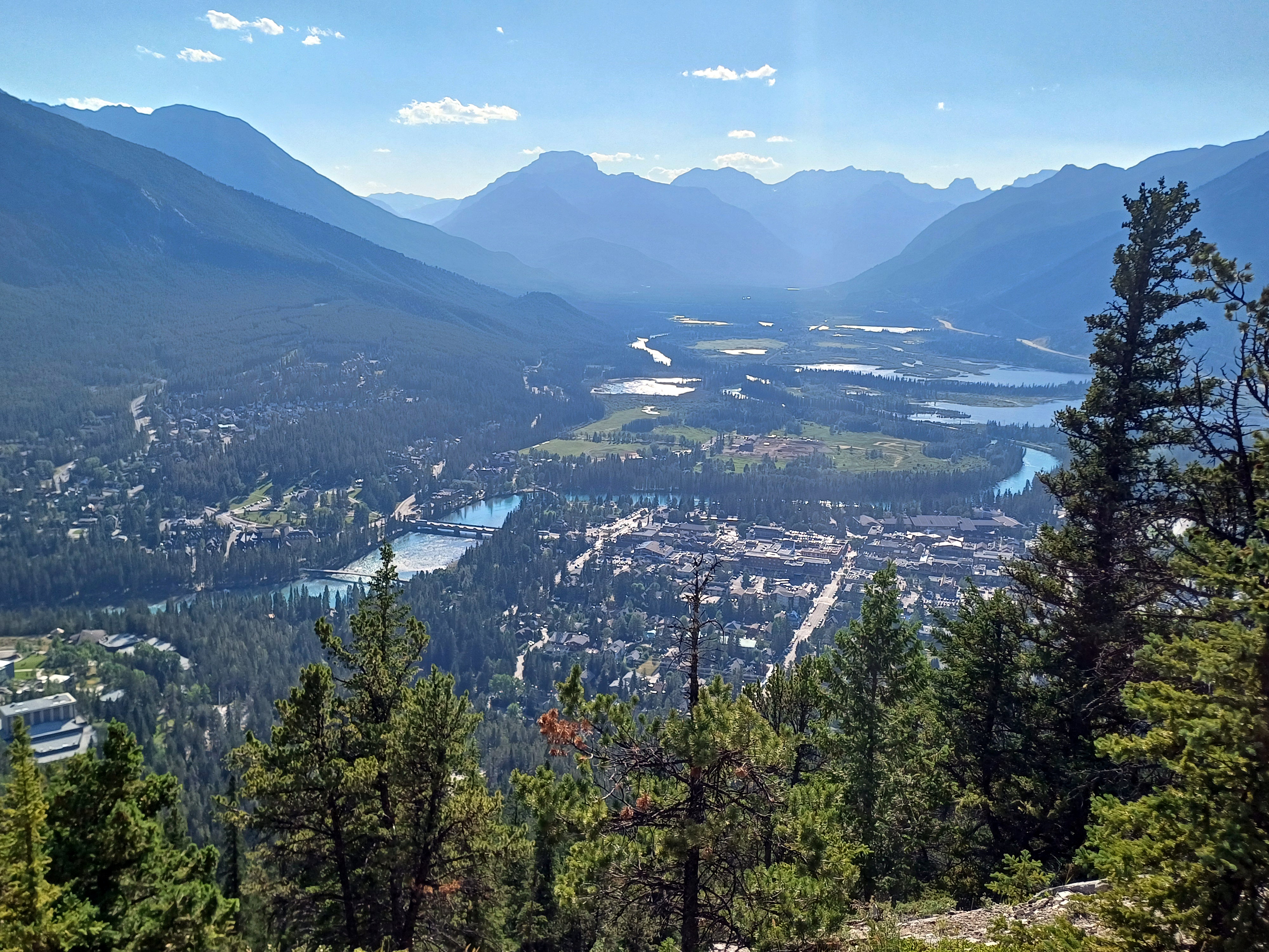 Por la tarde volvimos a Banff y, después del segundo intento fallido de encontrar transporte al lago Moraine, decidimos subir al Tunnel Mountain, el monte más subido o transitado de las Rocosas. Y, ¿por qué? Bueno, pues porque es un pequeño monte, digamos, dentro de Banff, al que cuesta poco rato subir, dependiendo desde dónde lo hagas, pero desde el centro del pueblo un poco más de media hora. Desde allí la verdad es que alcanzas unas vistas preciosas de todo Banff y sus alrededores. ¡La subida es empinada, pero merece la pena! Cuando bajamos del monte, acalorados, nos regalamos unos deliciosos helados paseando por el ajetreo de Banff.