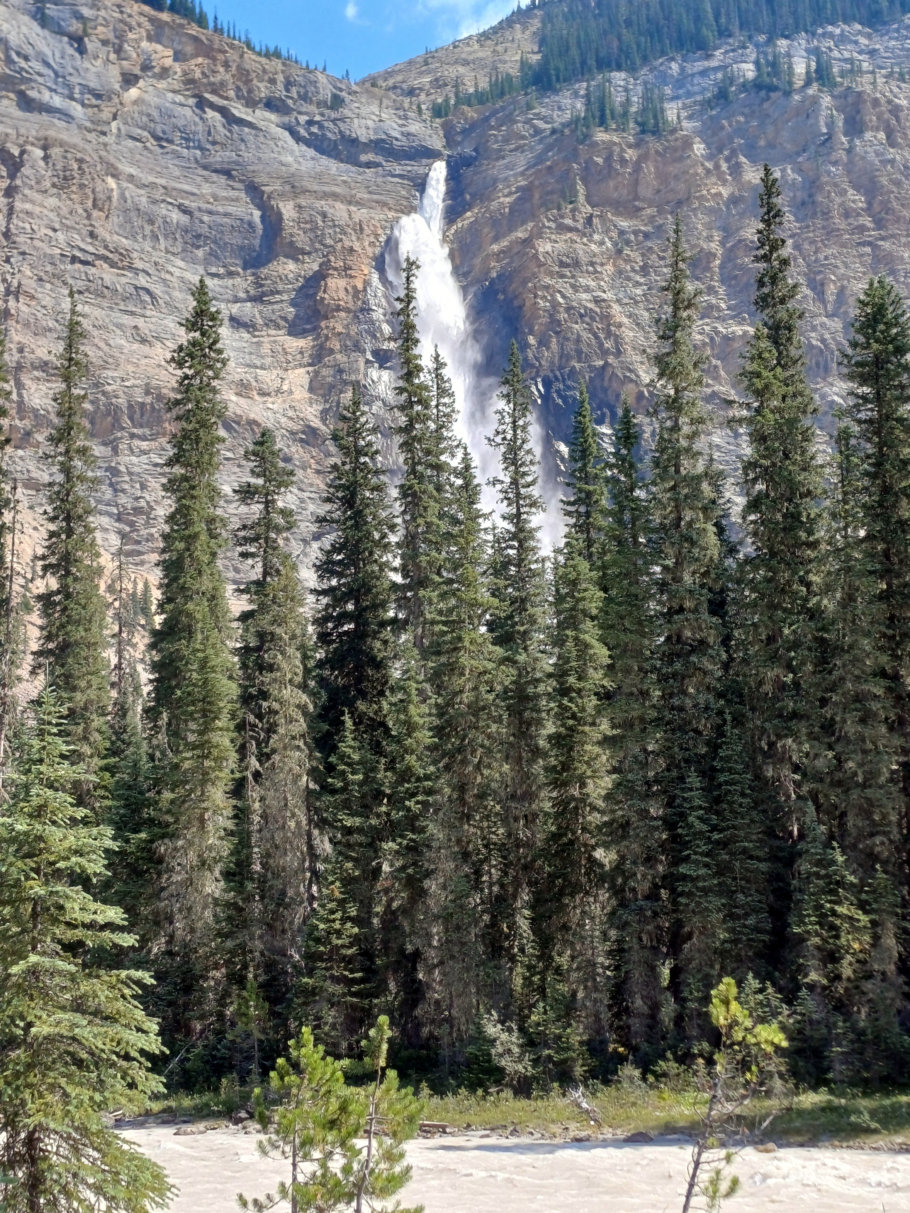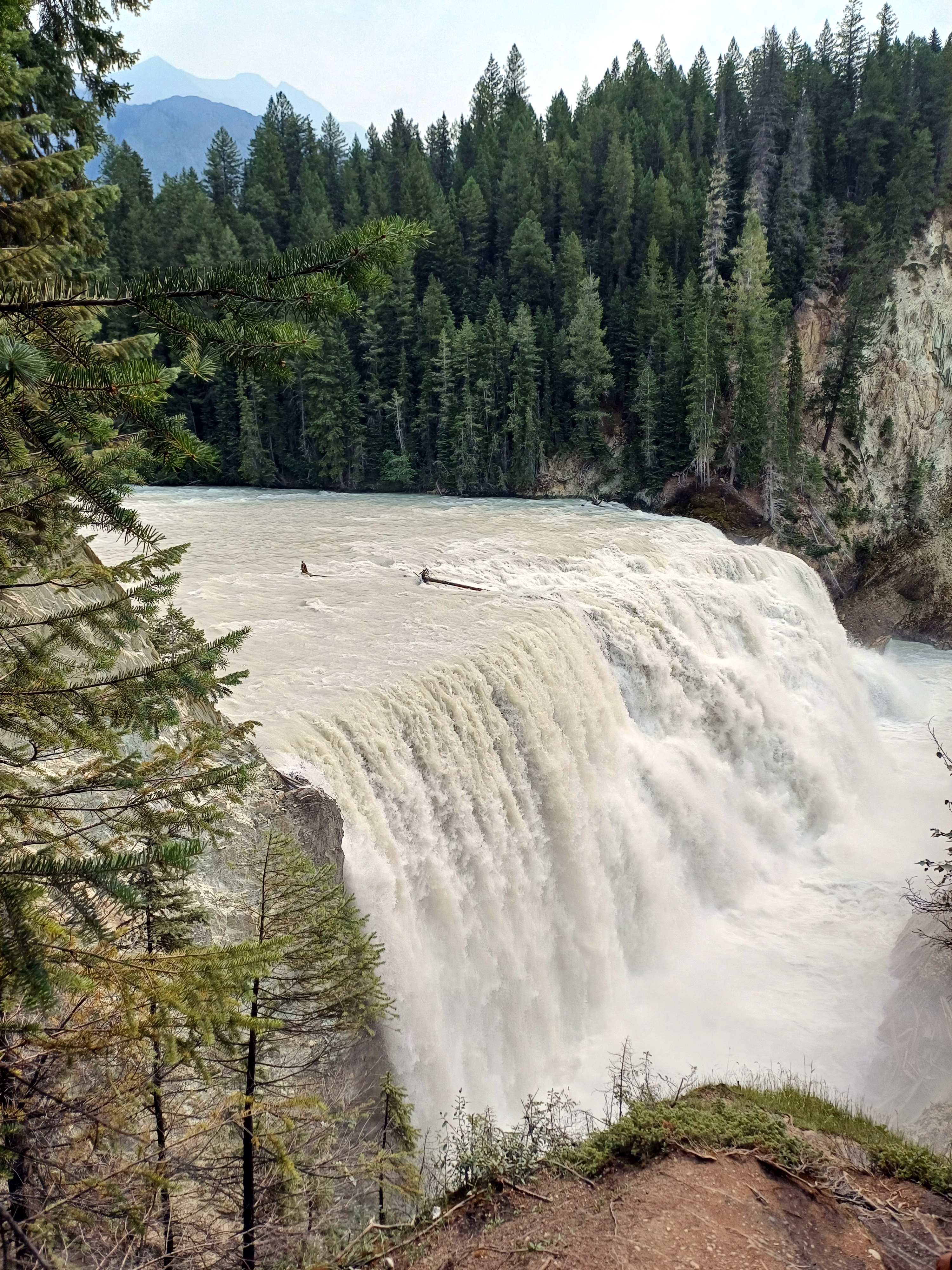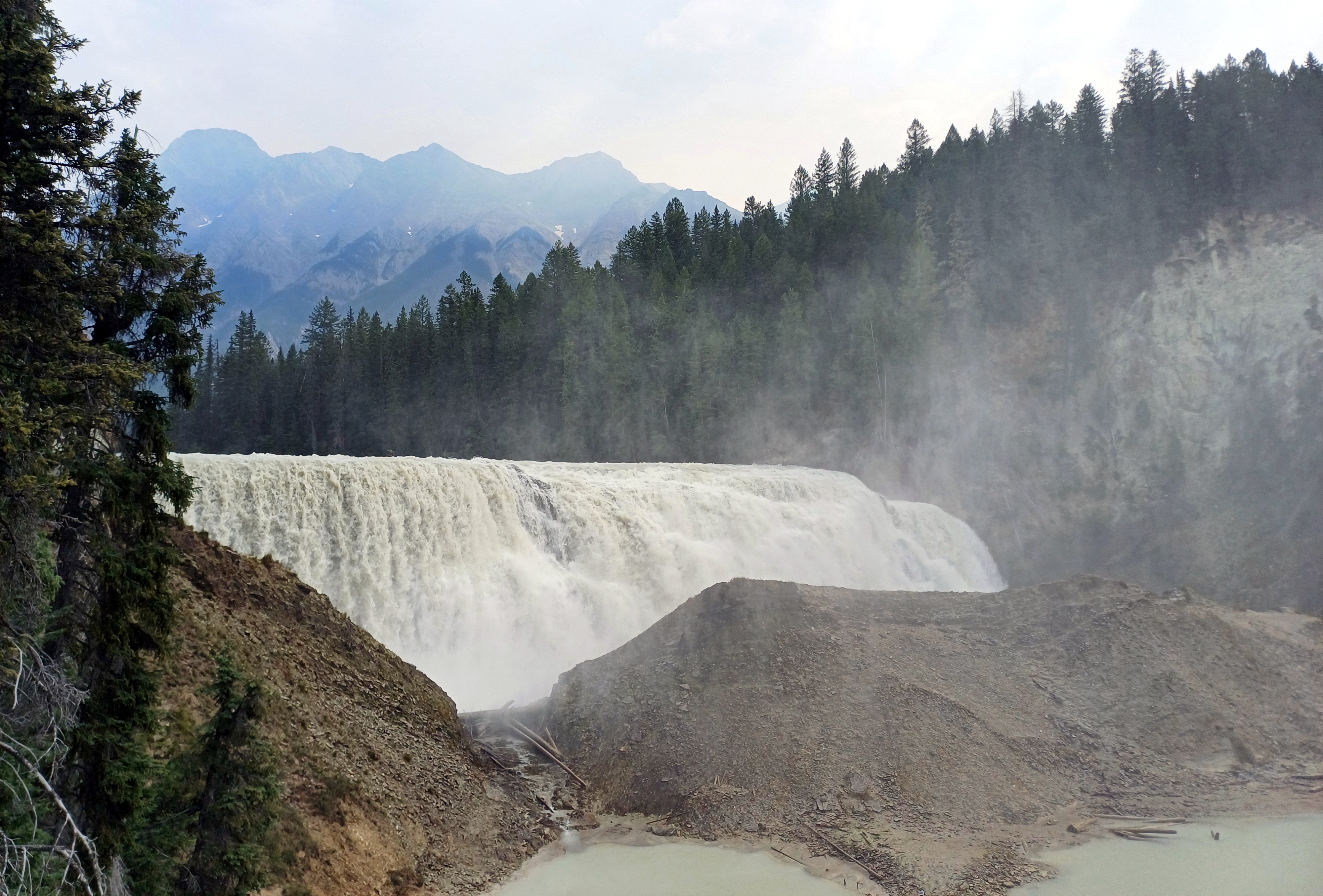 Wapta Falls fue el último enclave natural que visitamos en el parque natural de Yoho. Para llegar al parking de estas cascadas hay que coger una pista que no está en el mejor de los estados, pero, despacito, se puede hacer en autocaravana. Eso sí, cuando llegamos al final, había un jaleo de coches y de gente… Desde el parking, hay que andar por una senda un rato (más o menos 20 minutos o media hora) y llegas a la cascada. Esta es una de esas cascadas anchas, muy anchas, de color blanco lechoso, como si fuera el agua embravecida de una riada.