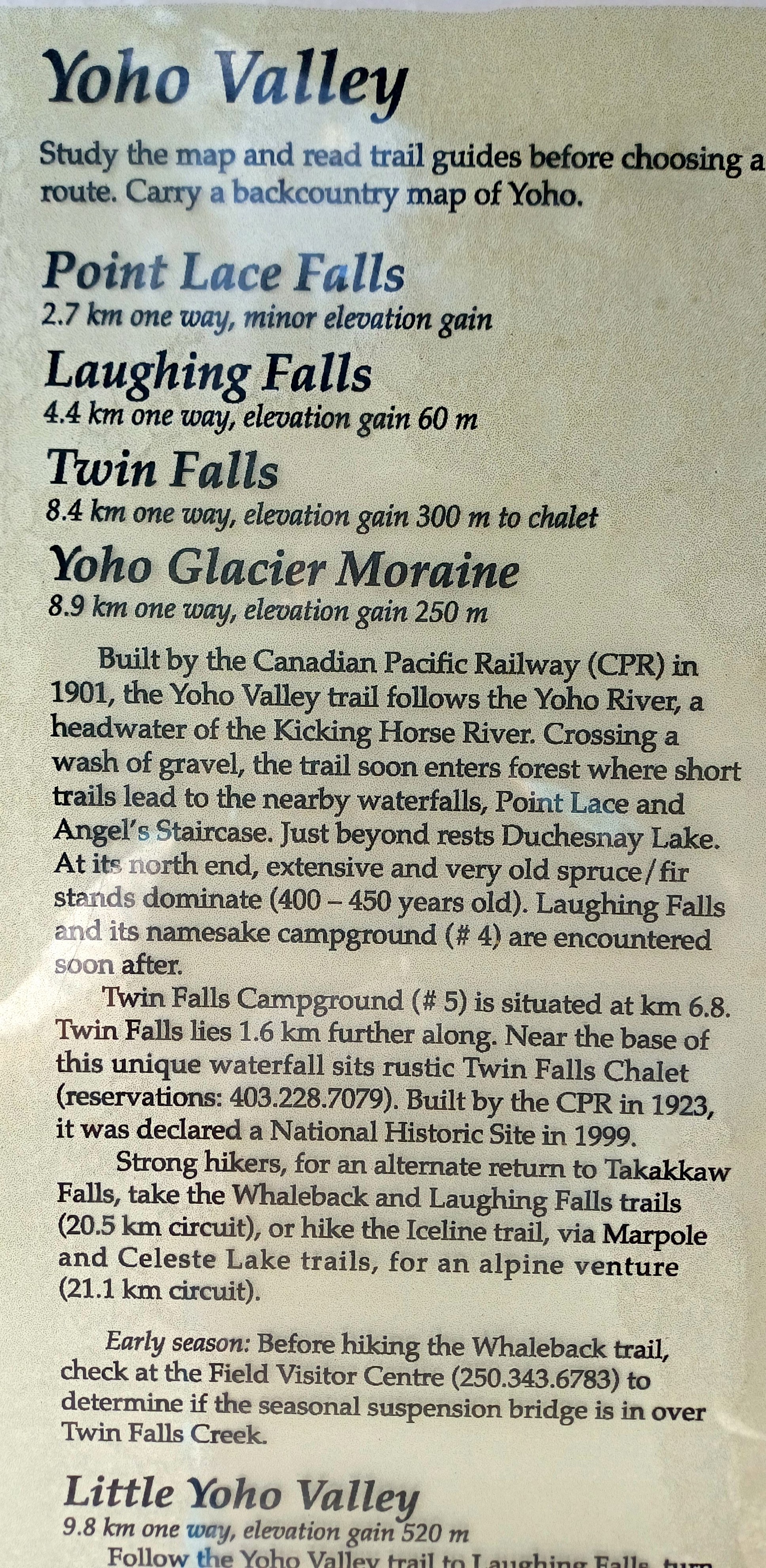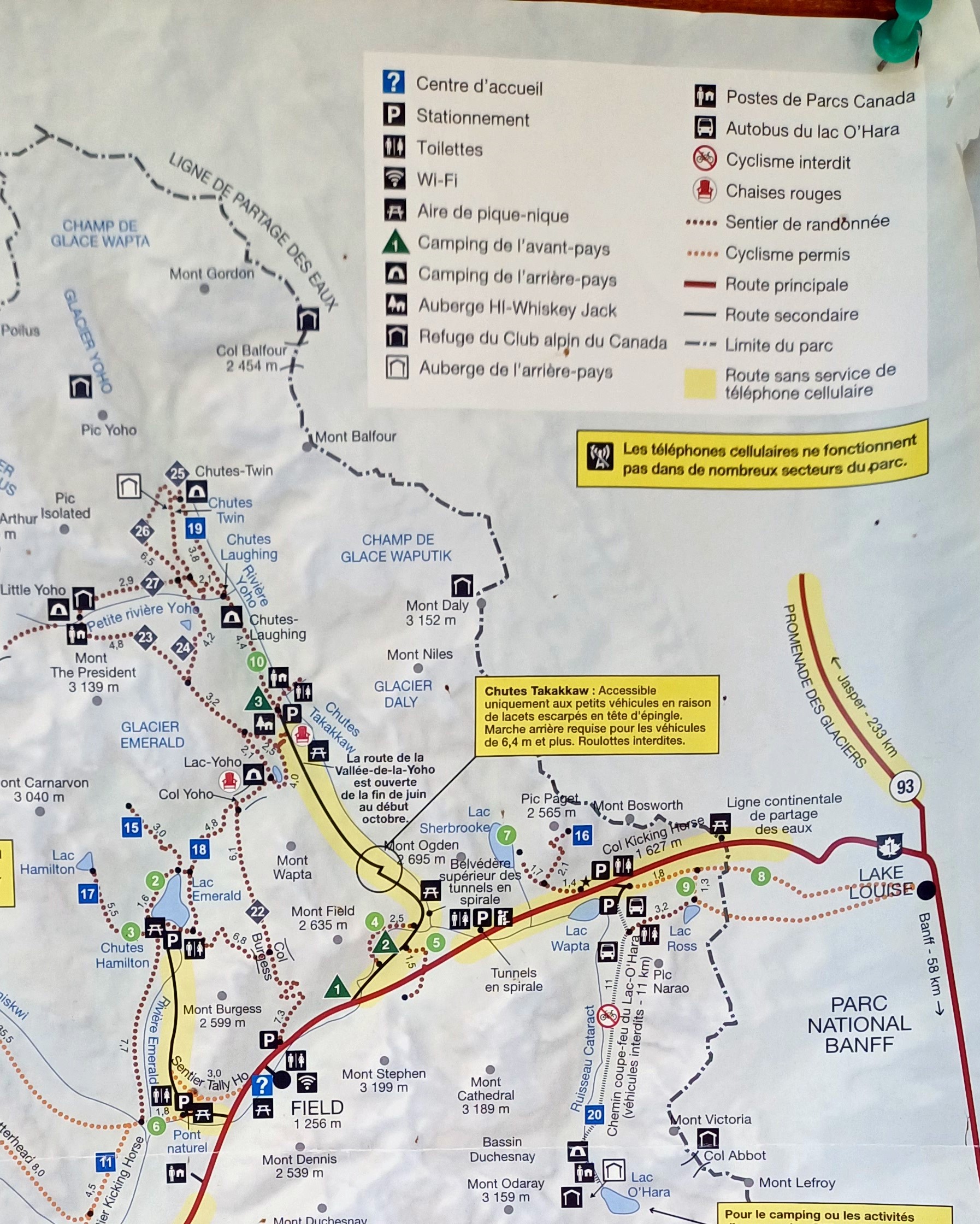 La siguiente parada desde Banff, en la ruta por las rocosas es el parque natural de Yoho, es pequeñito (comparado con los otros) y lo visitamos ya como puerta de salida de las Rocky Mountains. Nos alojamos dos noches en un camping que antaño era campamento de los constructores de las vías del ferrocarril del cercano pueblecito ferroviario de Field: the Kicking Horse Campground. Es un camping muy completo, incluso con duchas, estación de aguas grises y negras y hasta animación diaria para los peques. Así que es muy buena opción para alojarse en Yoho. Eso sí, por la noche se oye de vez en cuando pasar a los trenes, que inundan las montañas de una vibración metálica, con un aire casi místico.