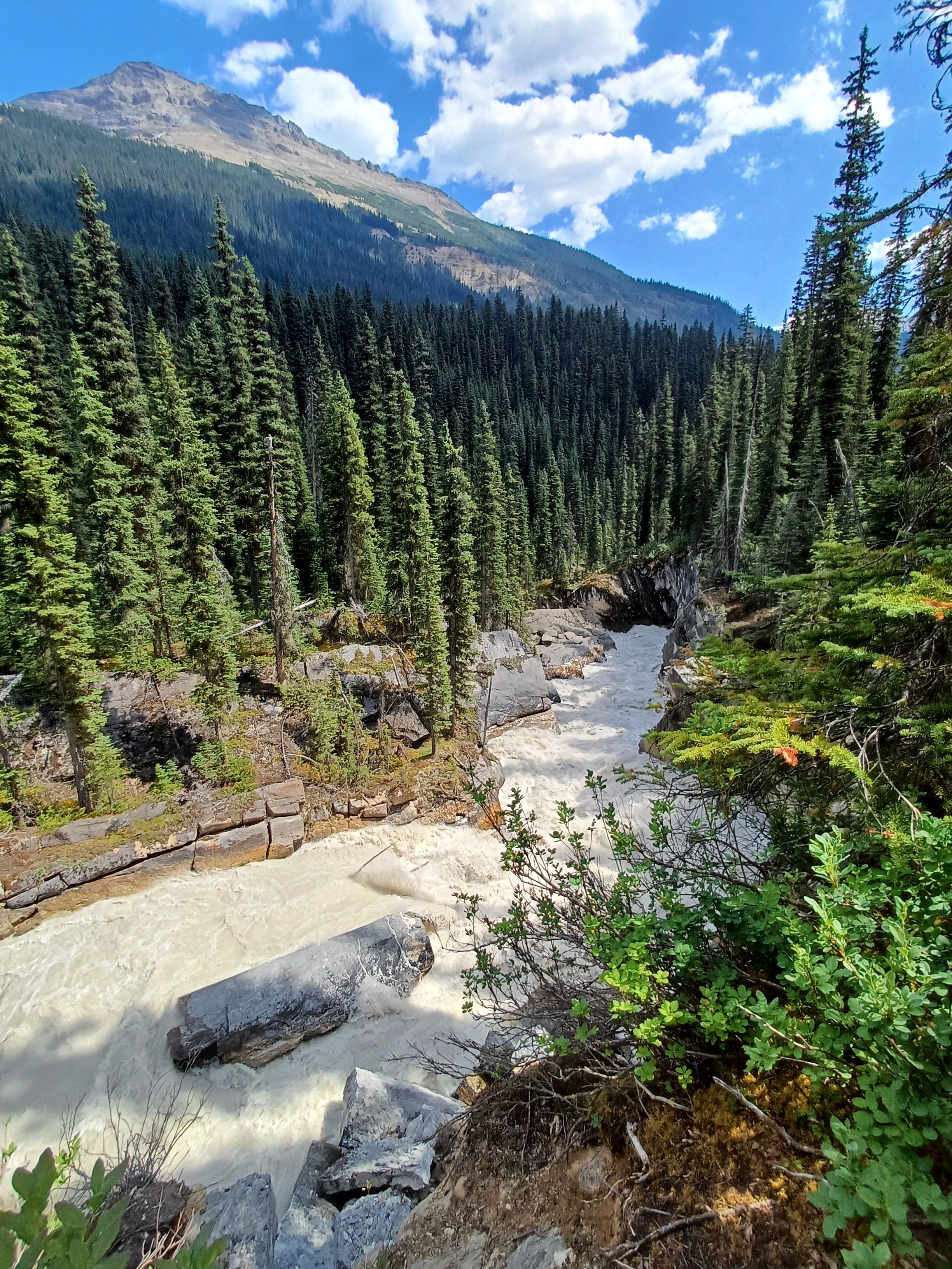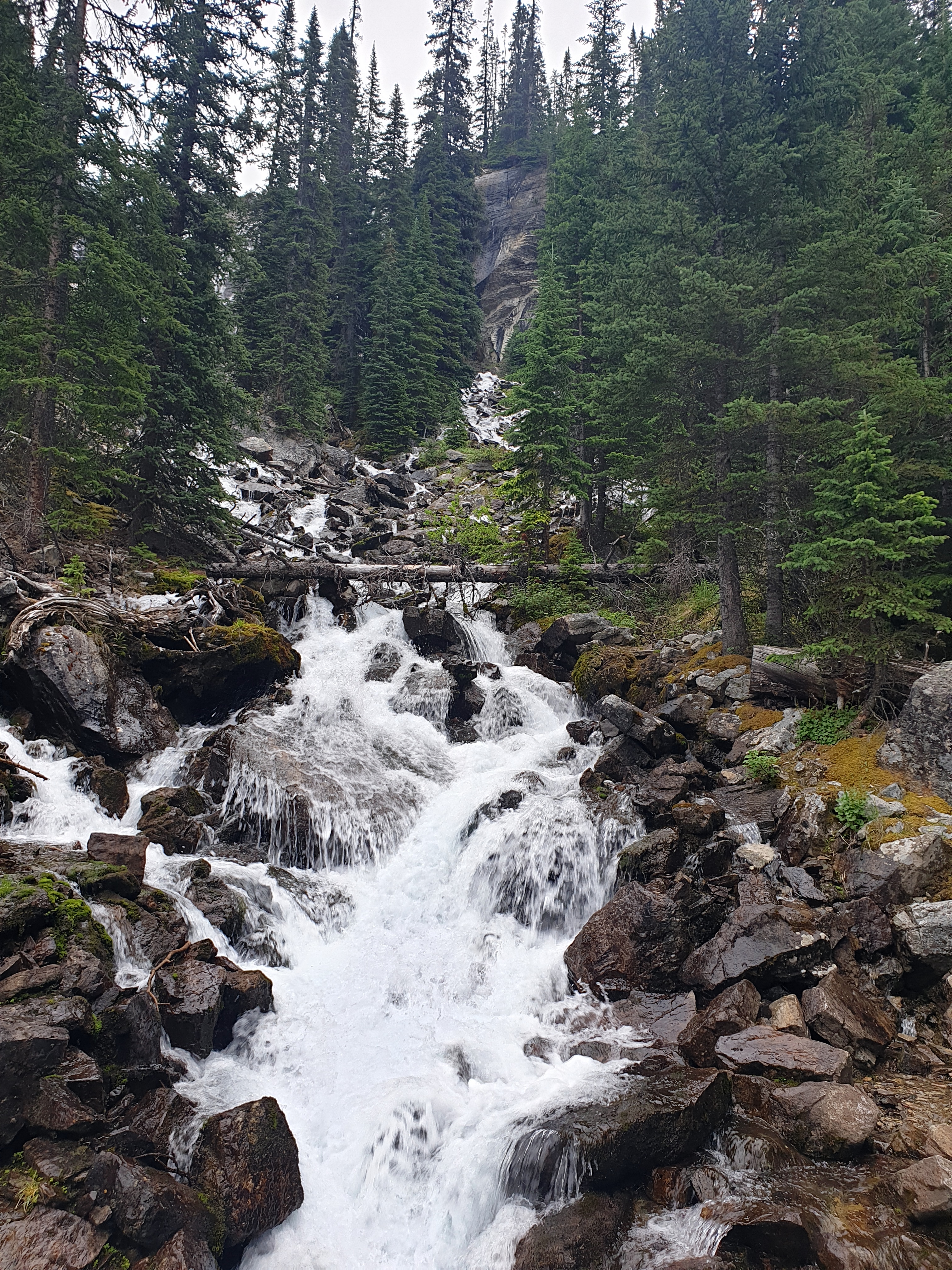 Ya en el Yoho Valley hay una larga ruta que se puede hacer en diferentes etapas llamada Iceline Trail. Nosotros anduvimos un tramo que comenzaba al pie de las Takakkaw Falls y llegamos poco más allá de las Laughing Falls. La cascada Takakkaw es uno de esos imponentes saltos de agua que se arrojan con mucha fuerza desde bien arriba, de hecho es la segunda cascada más alta de Canadá, mientras que la cascada Laughing es pequeñita y da lugar a un río entre cuyas aguas se forman pequeñas islitas en las que se puede acampar. El camino que hicimos era muy bonito, primero entre altos abetos, luego por el bosque, atravesando riachuelos por canchales… Pero nos detuvimos poco después de las Laughing Falls para comer y dar media vuelta. Así podríamos ir a ver el Emerald Lake por la tarde.