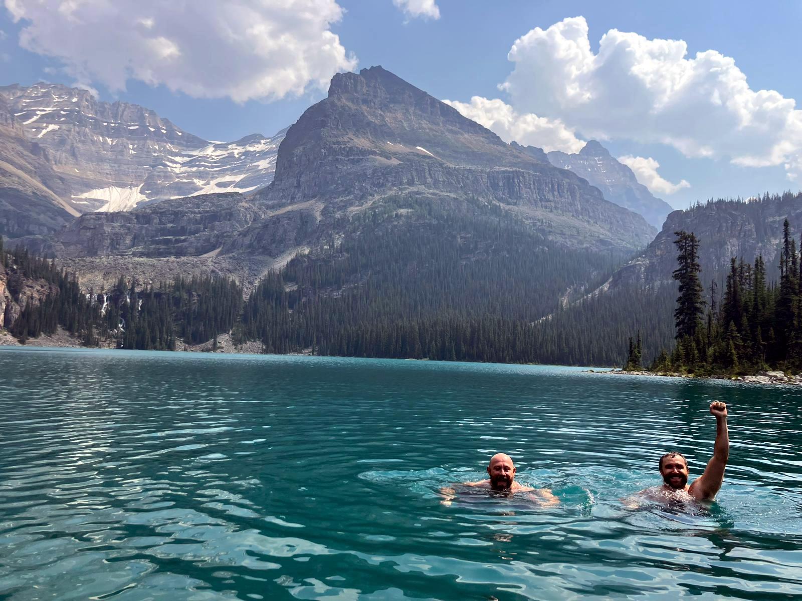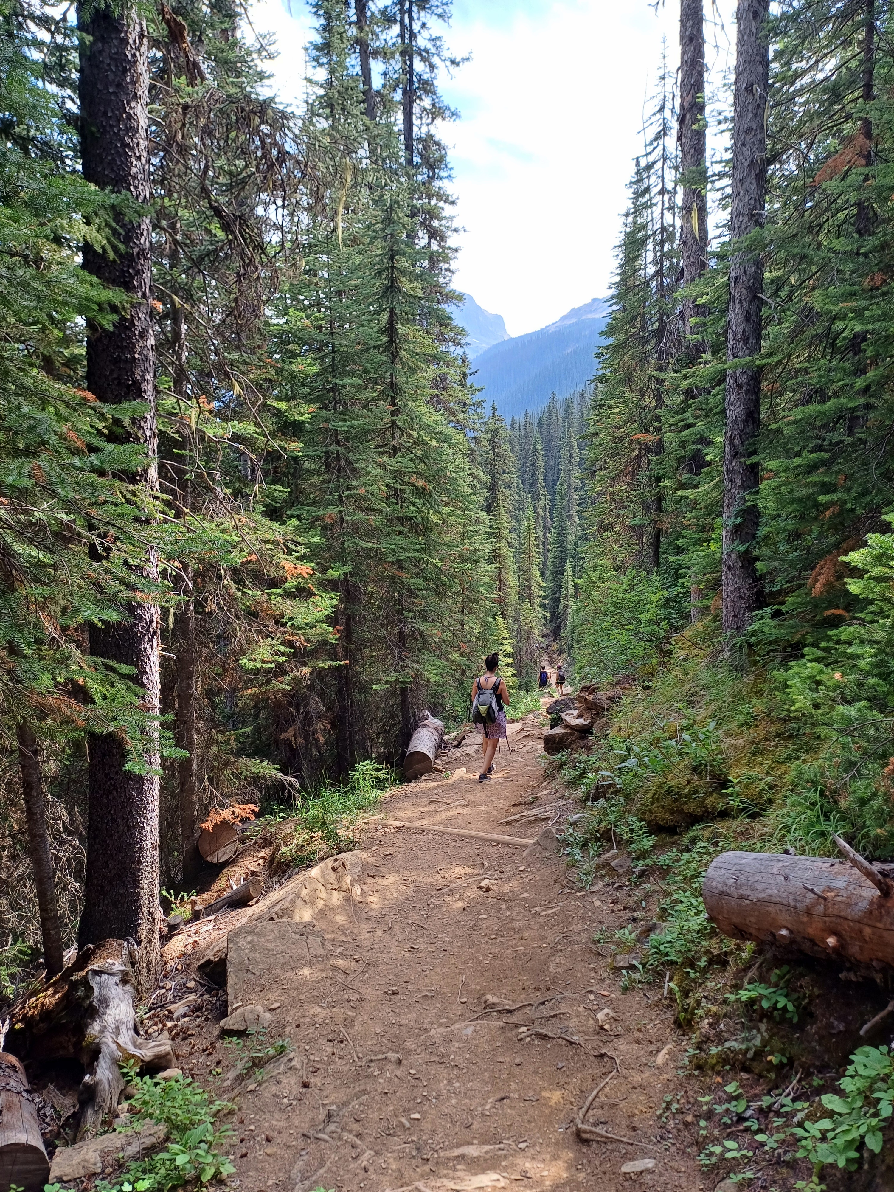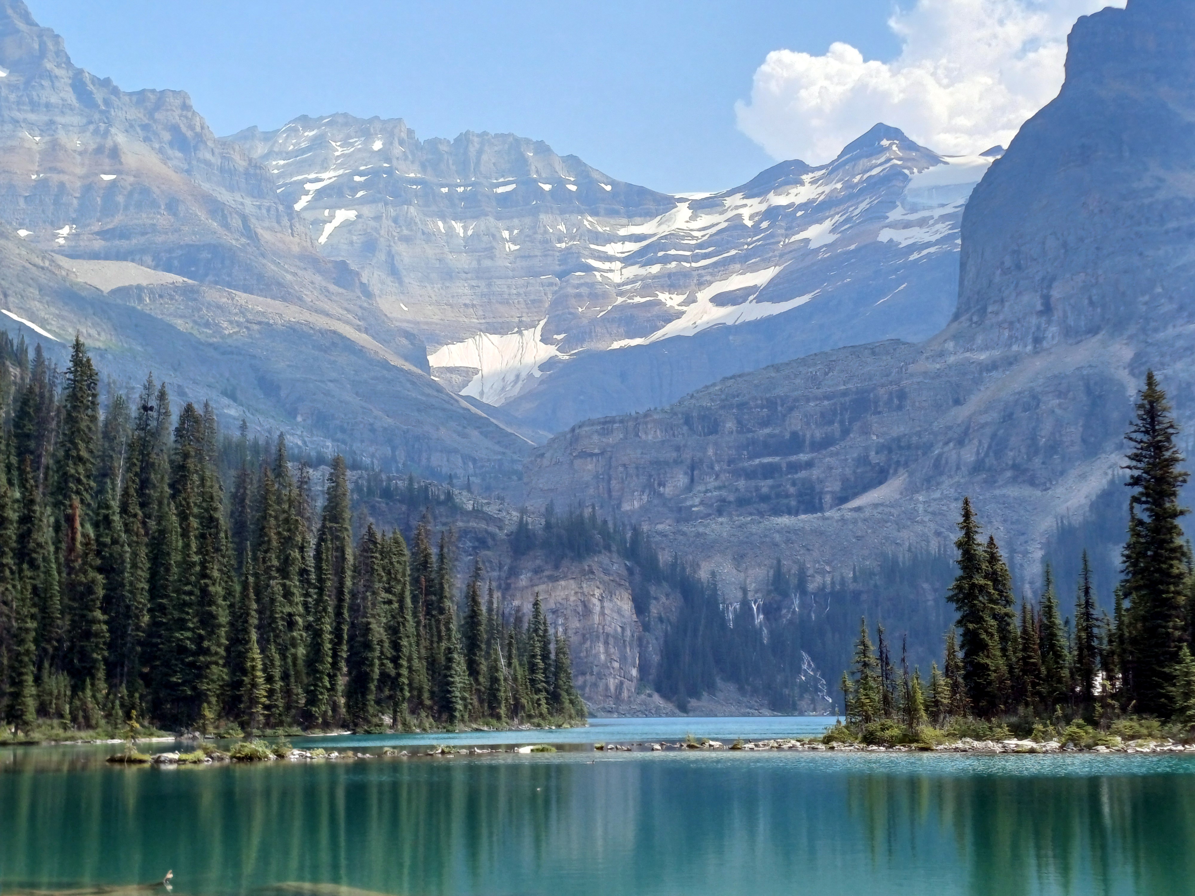 Es cierto que el camino se hace largo (especialmente a la bajada, cuando ya estás cansado), pero es muy cómodo porque va todo por pista y las vistas, con el bosque a los lados y las grandes montañas rodeándote, son bonitas. Por supuesto, merece mucho la pena. El Lake O’Hara reposa sus aguas turquesas muy tranquilamente, con pocos turistas que rompan la paz y, al fondo, se ven y escuchan unas cascadas que llegan hasta él desde un glaciar.