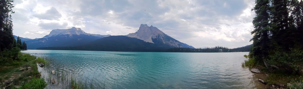 Al Emerald Lake se puede llegar en coche y, además de unas cabañas-hotel, hay bar. Quizás por eso había allí bastante gente bañándose o haciendo picnic. Es un lago precioso. De nuevo, aguas turquesas y un frondoso bosque que rodea sus orillas, con un sendero por el que se puede dar la vuelta al lago. Nosotros anduvimos un poco hasta que encontramos un rincón agradable y tranquilo en el que darnos un baño. Sin embargo, el paseo alrededor del lago que queríamos hacer después se nos fastidió porque se preparó rápidamente una tormenta.