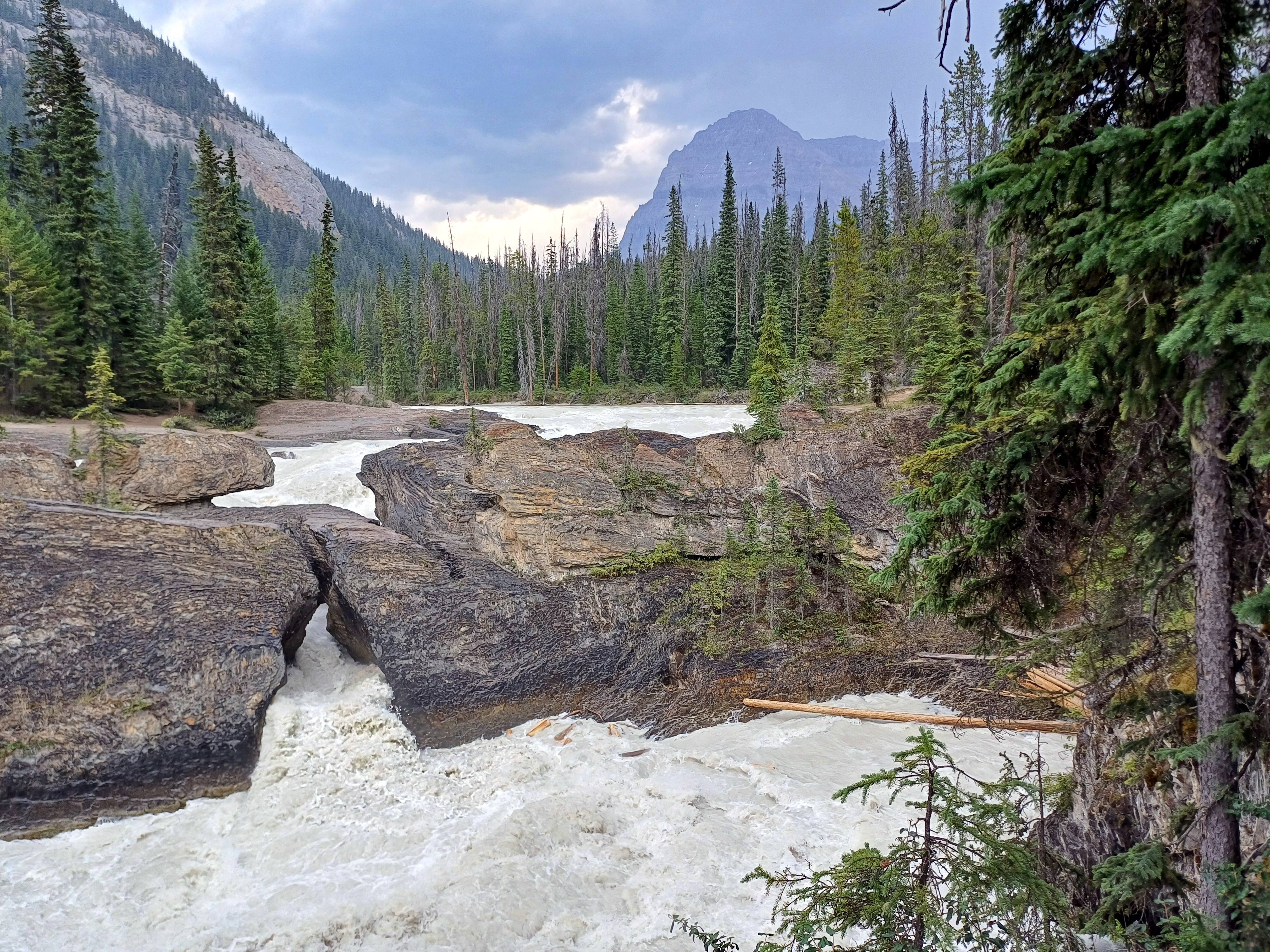 Como toda tormenta no dura demasiado, bajando del Emerald Lake ya apenas llovía y eso nos permitió hacer una pequeña parada antes de volver a nuestro camping para ver el Natural Bridge, que está cerca del lago. El Natural Bridge es un capricho de la naturaleza en el que el agua fuerte del río ha tallado la roca de tal forma que se cuela por debajo, formando una especie de puente natural de roca. No se puede pasar por él, por supuesto, ¡no está tan bien tallado!